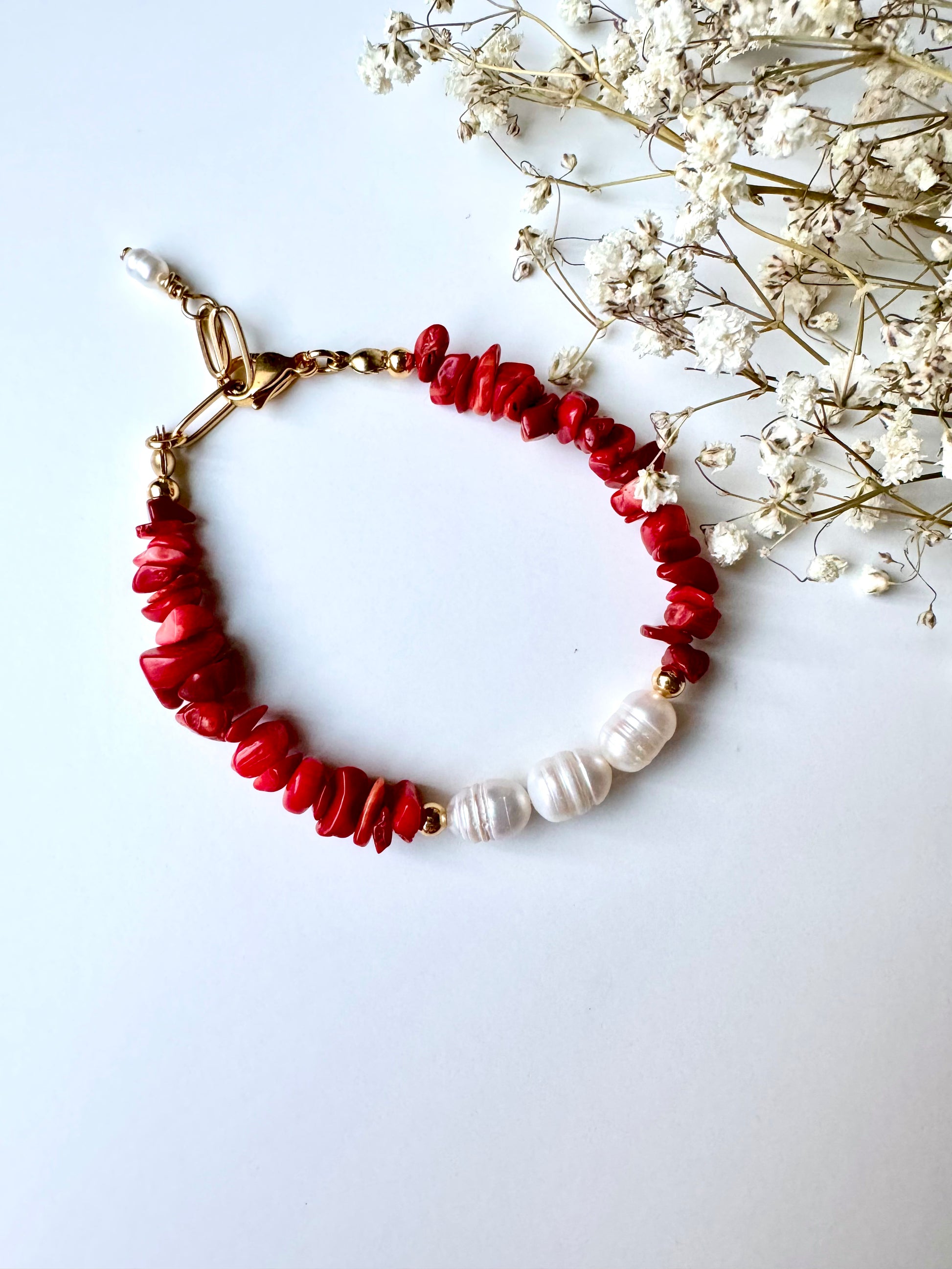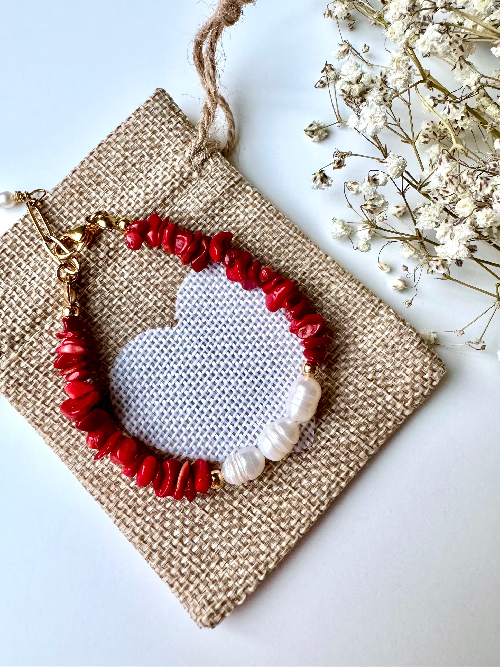 Dieses leuchtend rote Armband kombiniert natürliche Korallenstücke mit glänzenden Süßwasserperlen und goldfarbenen Akzenten. Die kraftvolle Farbkombination aus intensivem Rot und edlem Weiß verleiht dem Schmuckstück einen ausdrucksstarken Charakter. Ob solo getragen oder in Kombination mit weiteren Armbändern – dieses handgefertigte Piece ist ein echter Hingucker.