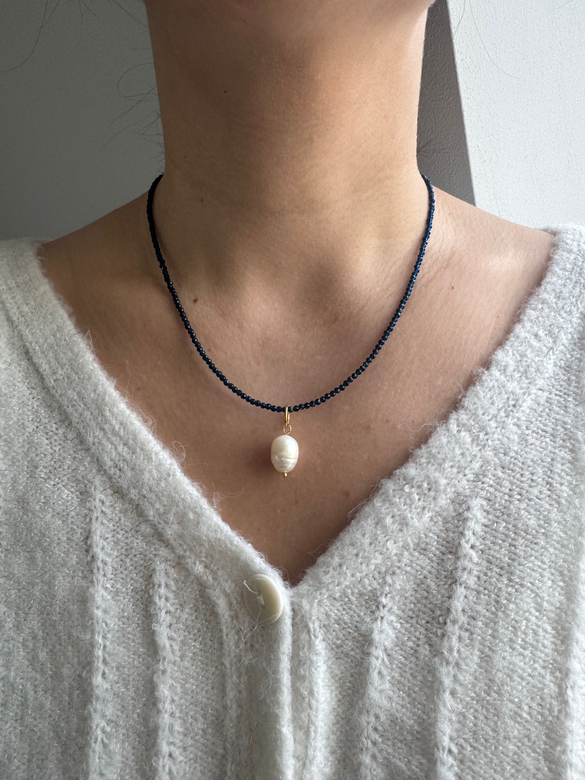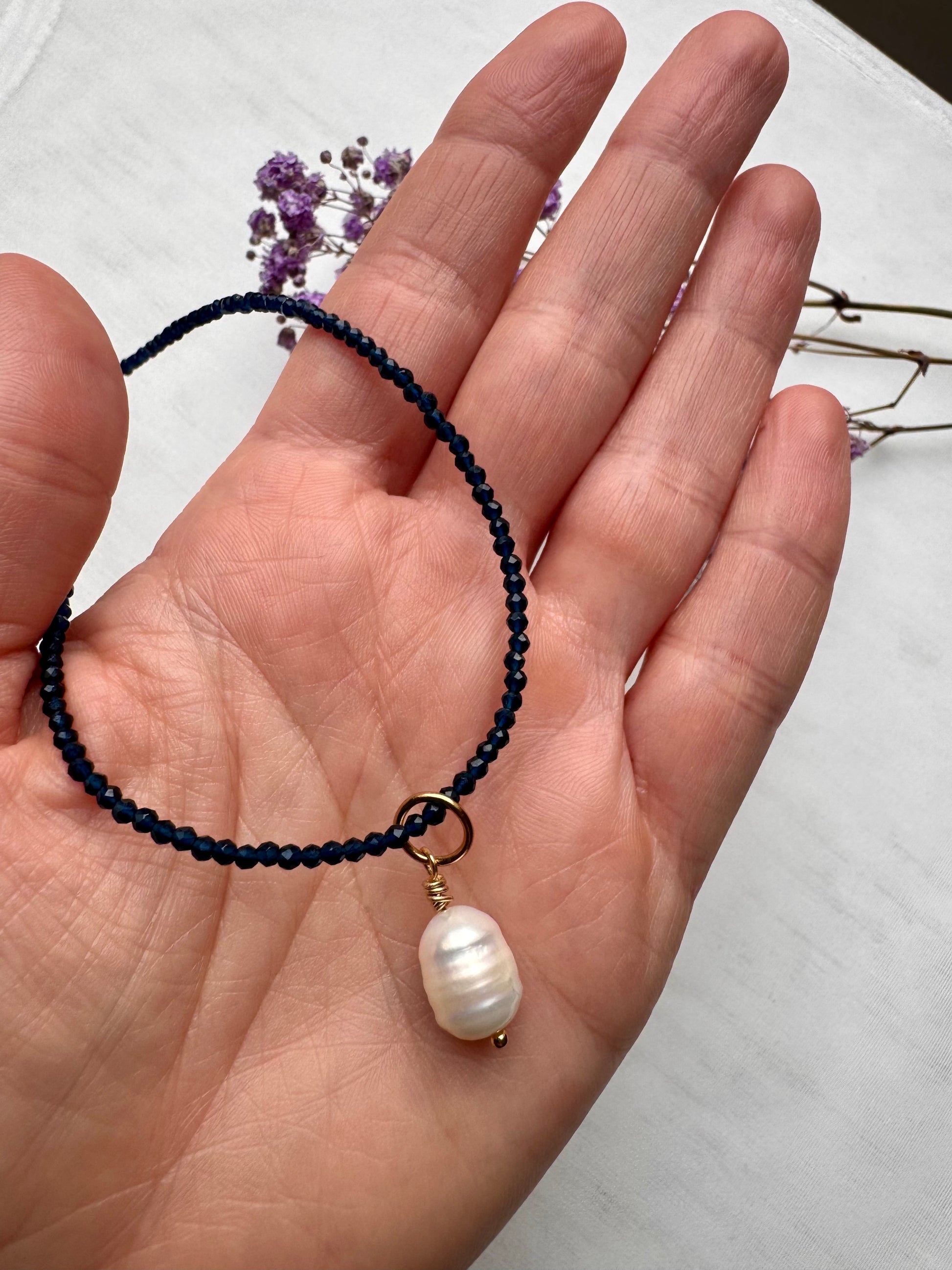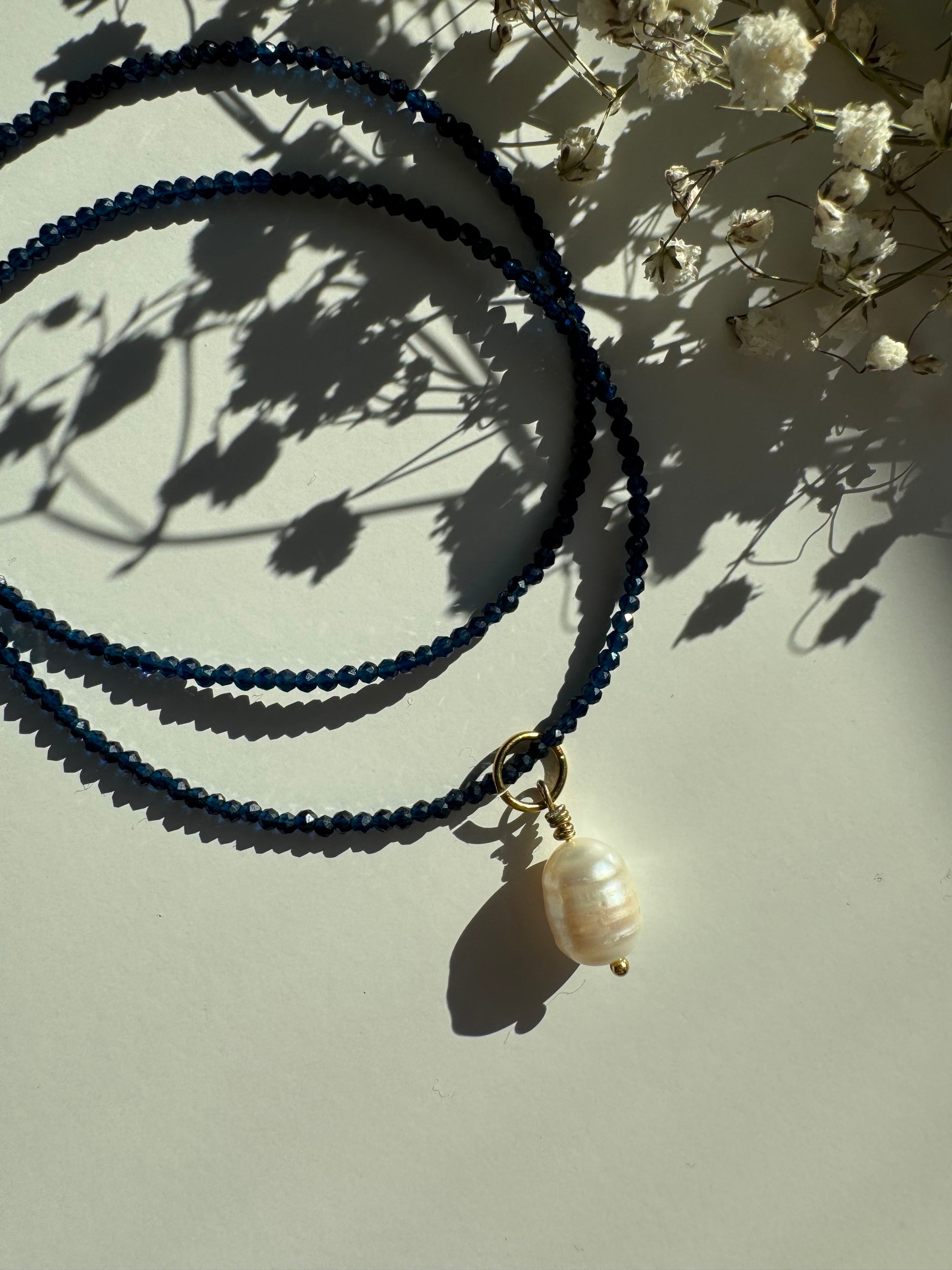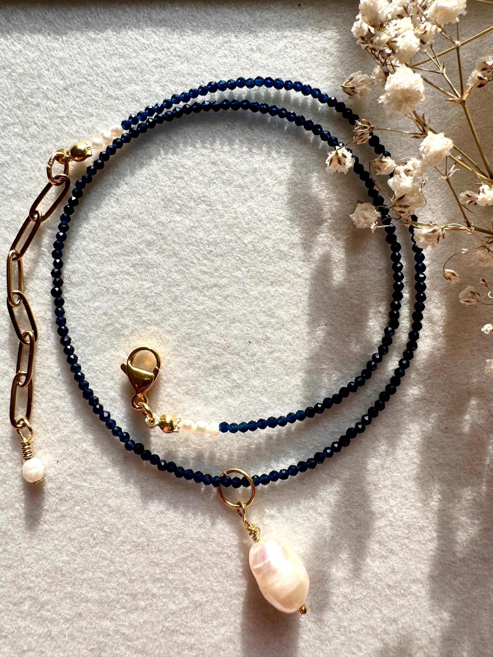 Diese zarte Halskette ist ein elegantes Highlight für minimalistische Schmuckliebhaber:innen. Sie besteht aus winzigen, facettierten Kristallperlen in tiefem Nachtblau (nur 2 mm groß!), die bei jedem Lichtstrahl dezent funkeln. Als zentrales Element sorgt eine edle Barockperle für einen natürlichen Kontrast und rundet das Design harmonisch ab. Der vergoldete Ring und die feine Verlängerungskette in 18k-Optik verleihen der Kette ein hochwertiges Finish.