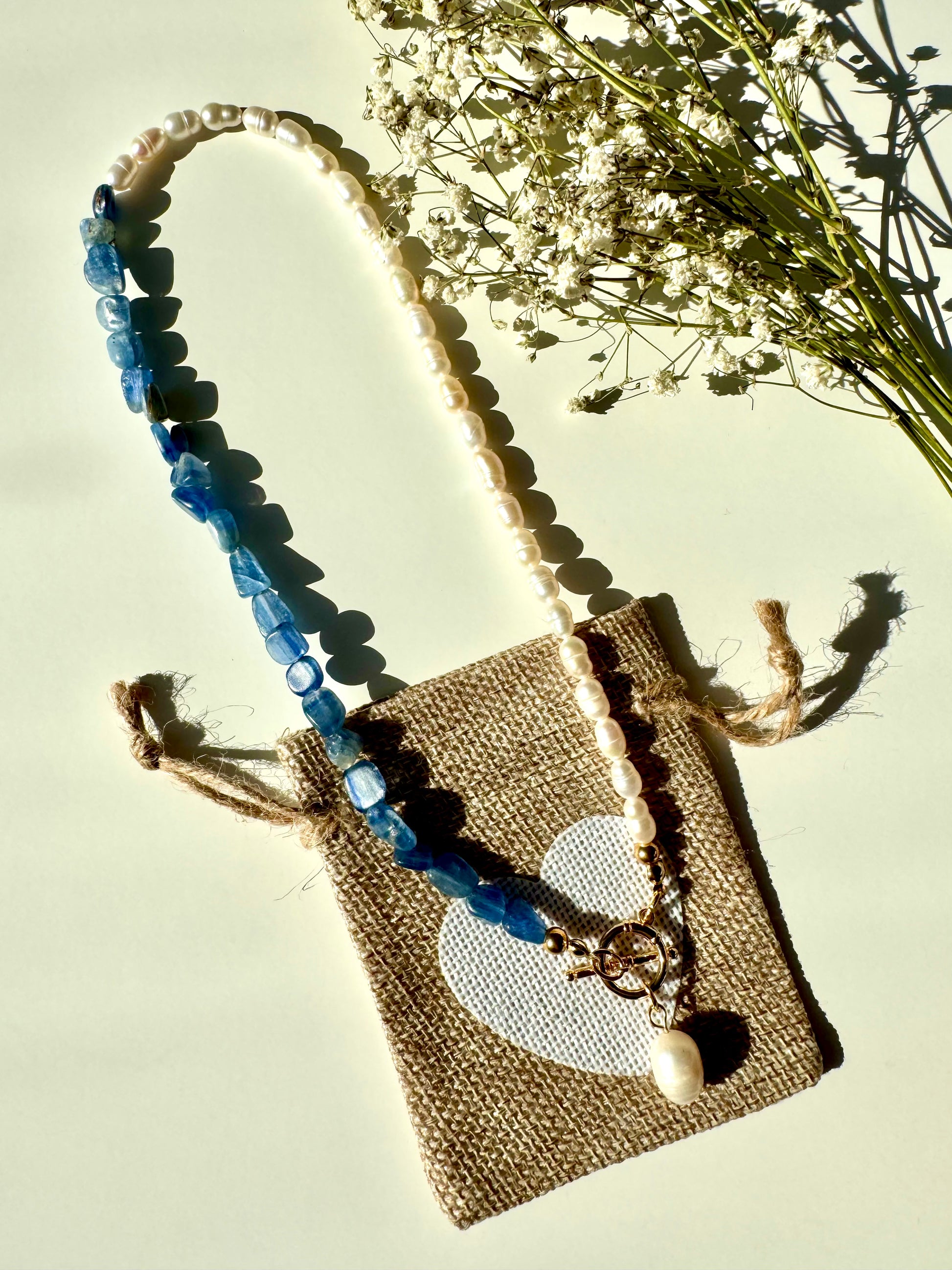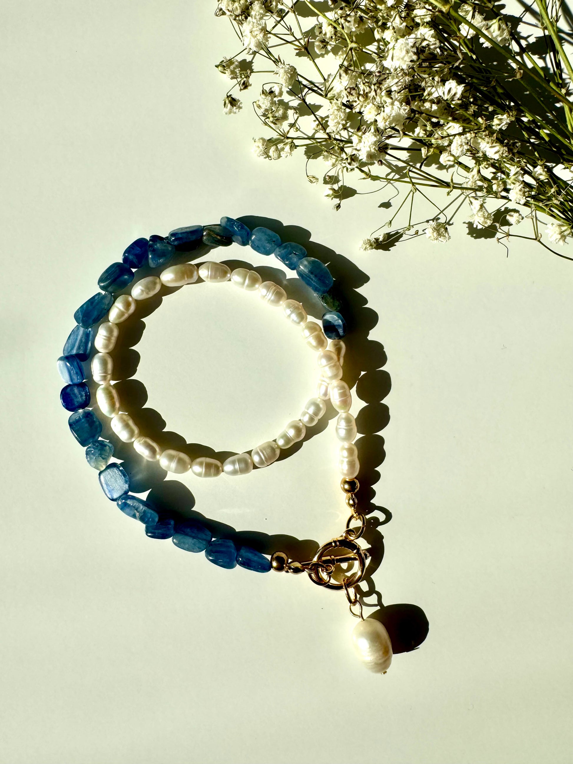 - Design: Kyanitsteine in Kombination mit zarten Süßwasserperlen und einem eleganten goldenen Verschluss für einen modernen Look