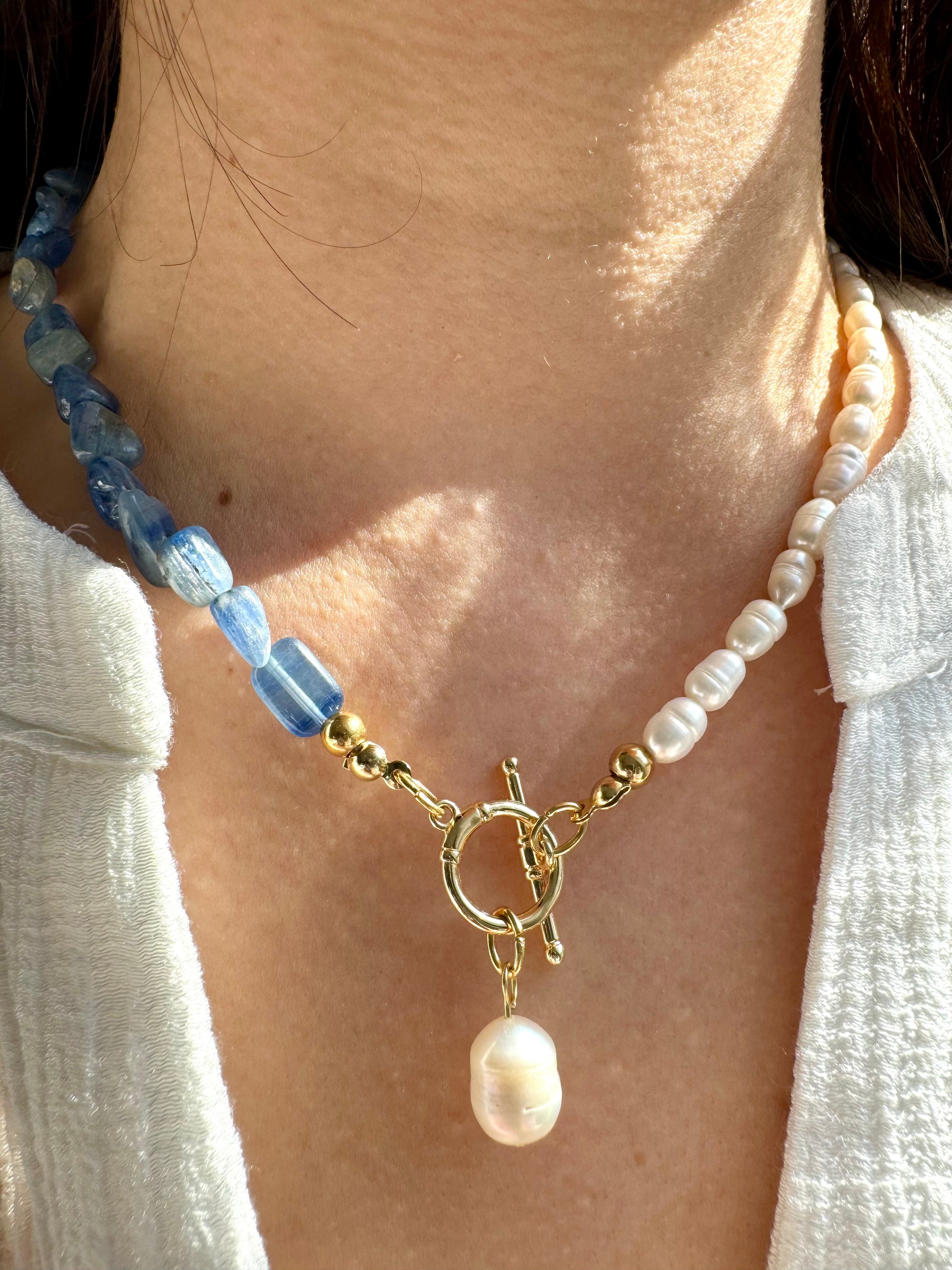 Kyanit-Halskette mit Süßwasserperlen & Barockanhänger