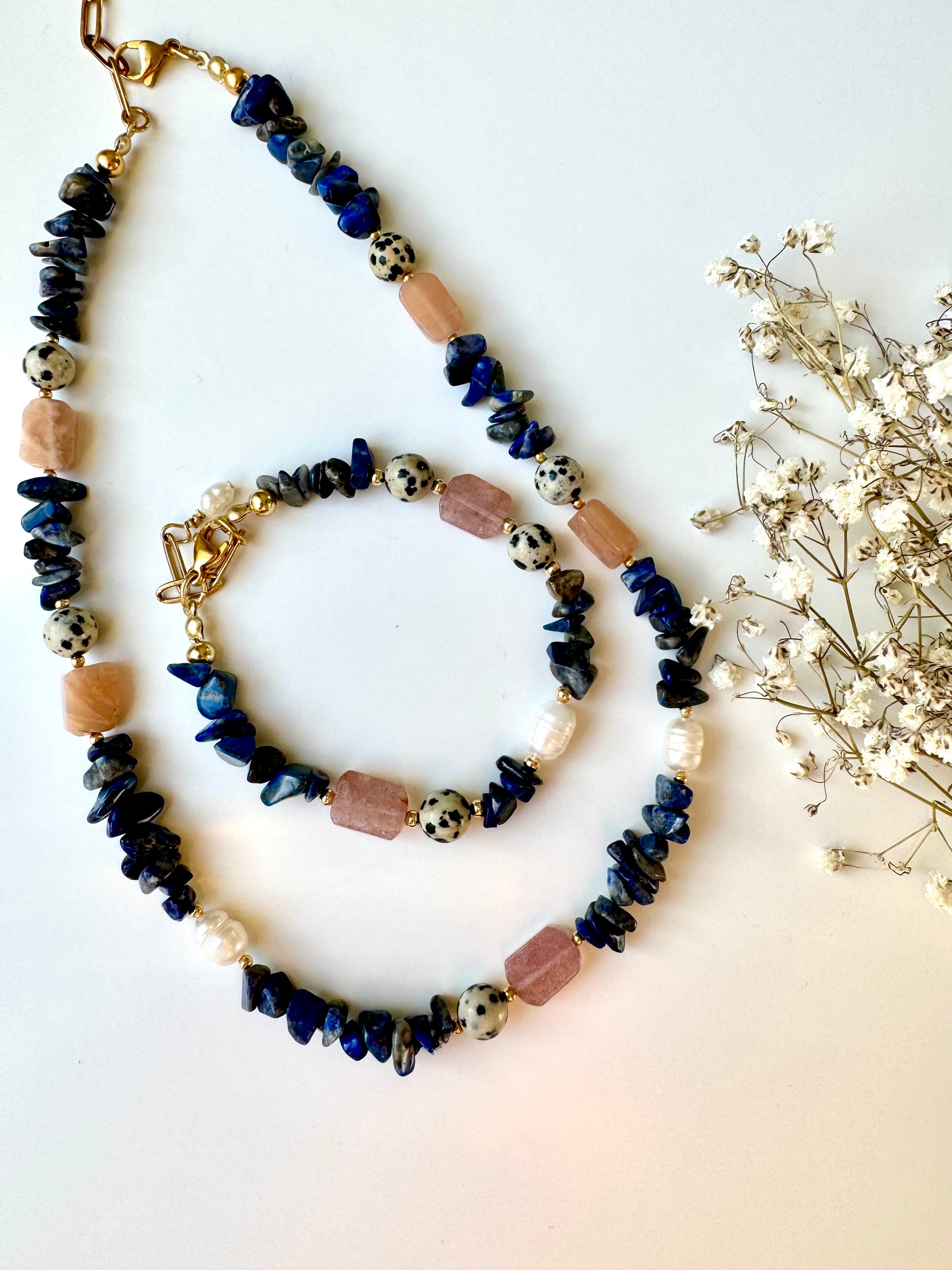 - Lapislazuli-Splitter, Dalmatiner-Jaspis, Rosenquarz & Süßwasserperle