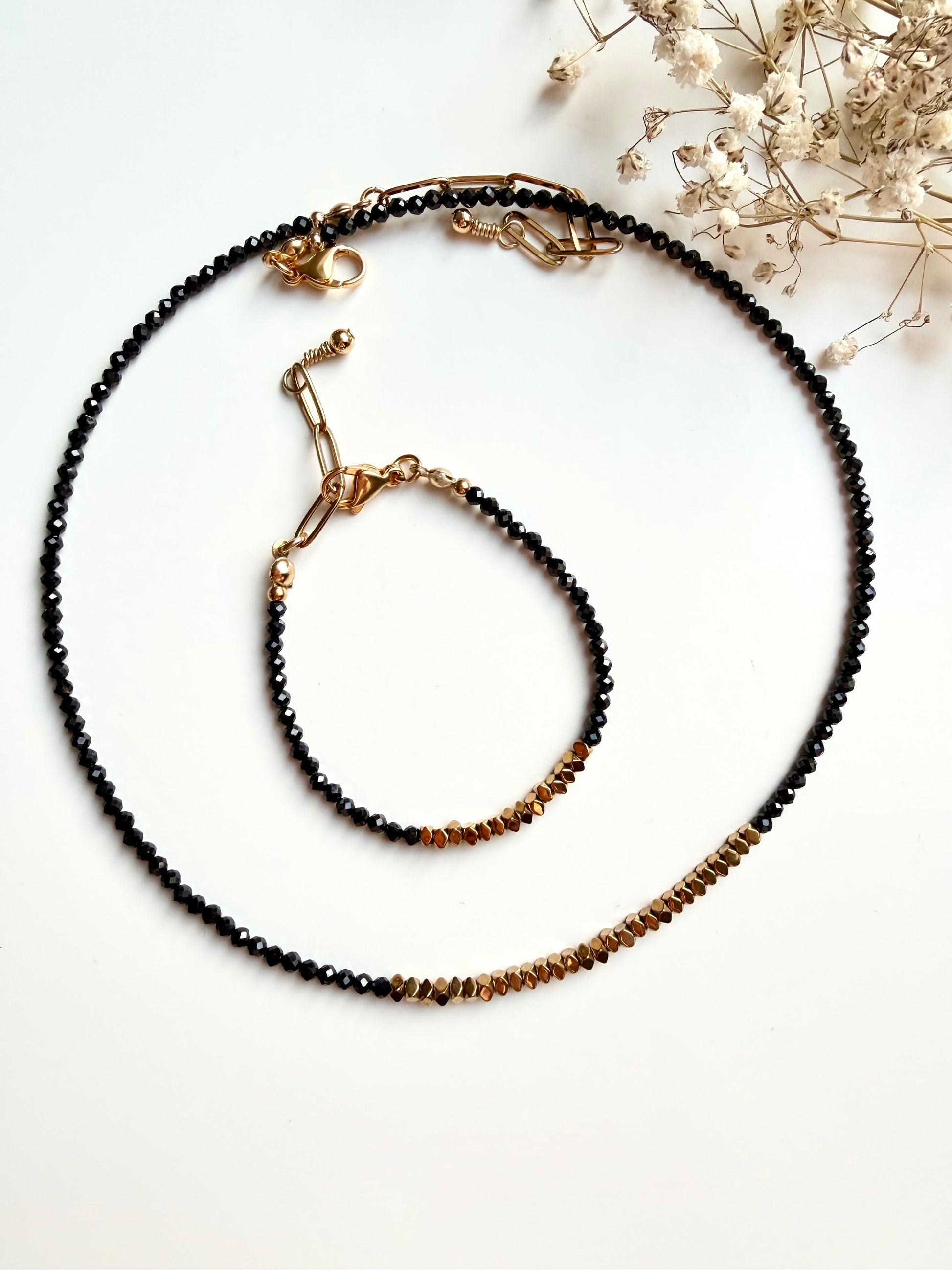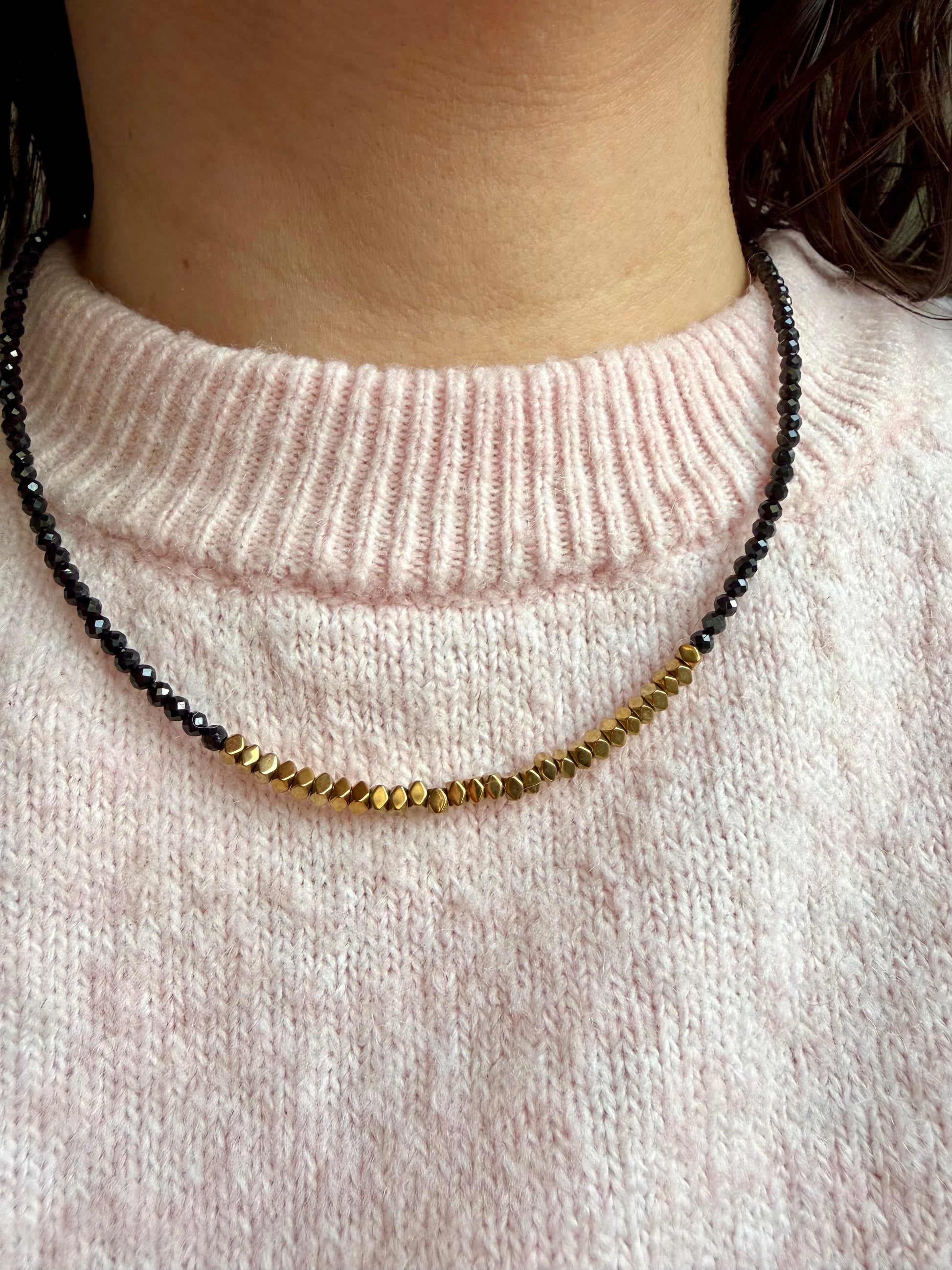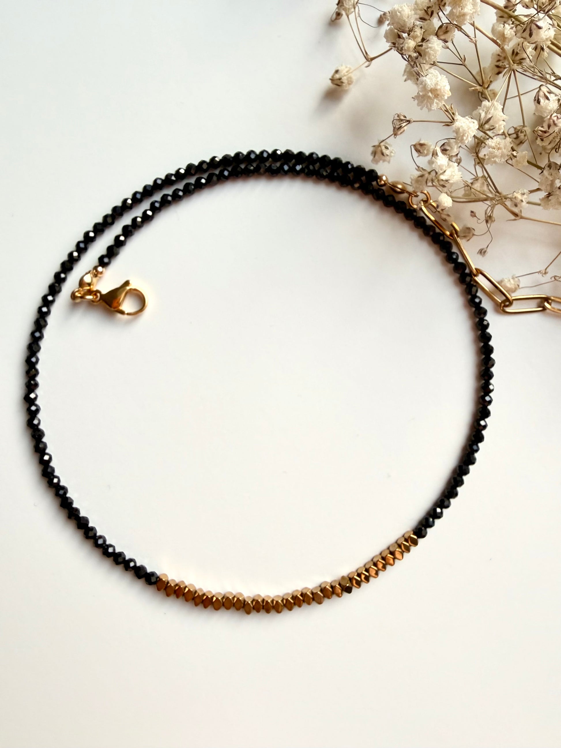 Die Midnight Edge Halskette besticht durch ihre klare, moderne Eleganz. Feine, facettierte schwarze Kristallperlen sorgen für einen dezenten Glanz und treffen auf goldfarbene Akzente, die dem Design eine edle Tiefe verleihen. Minimalistisch, zeitlos und vielseitig kombinierbar – ein Schmuckstück, das sowohl solo als auch im Layering überzeugt.