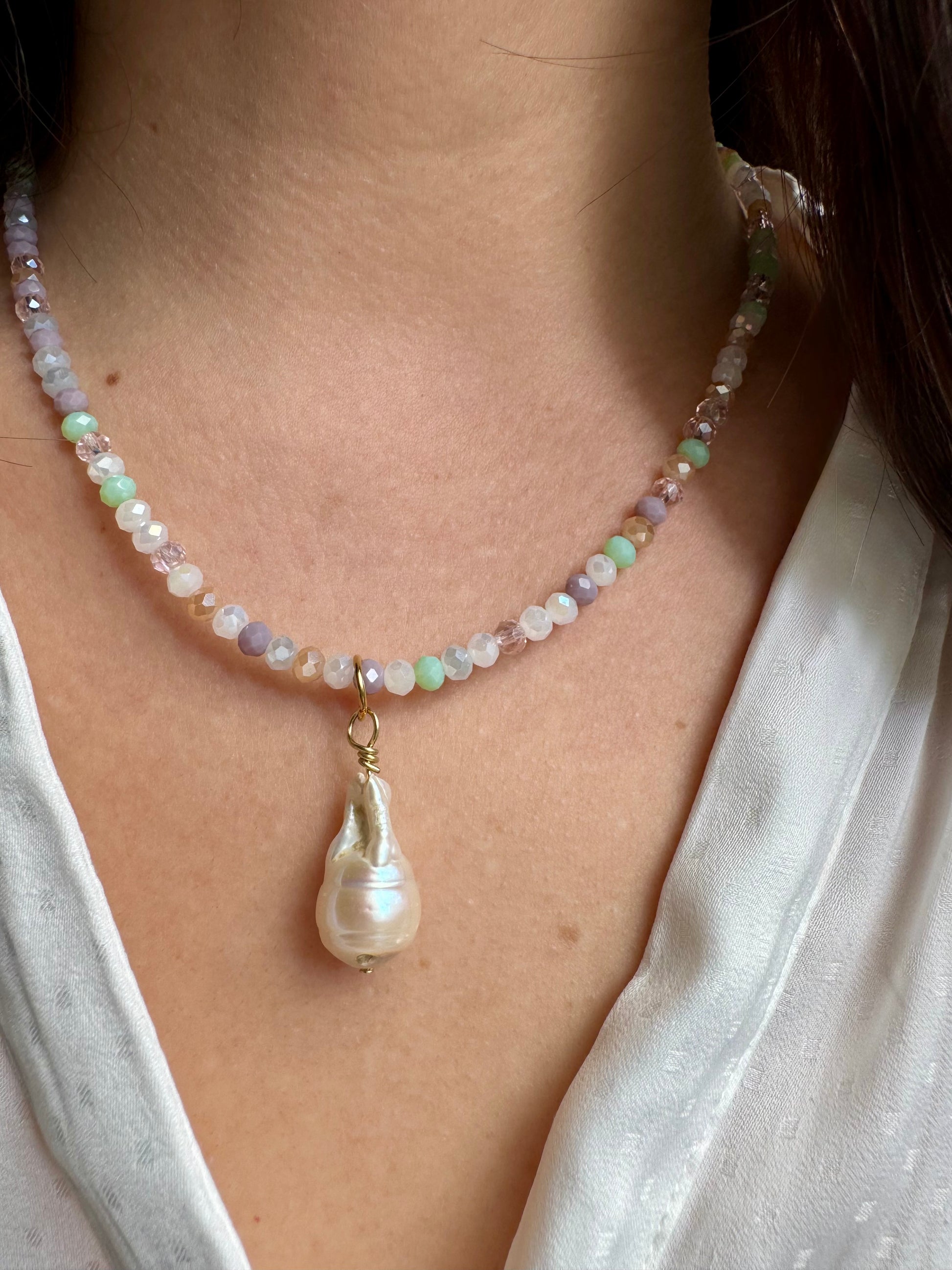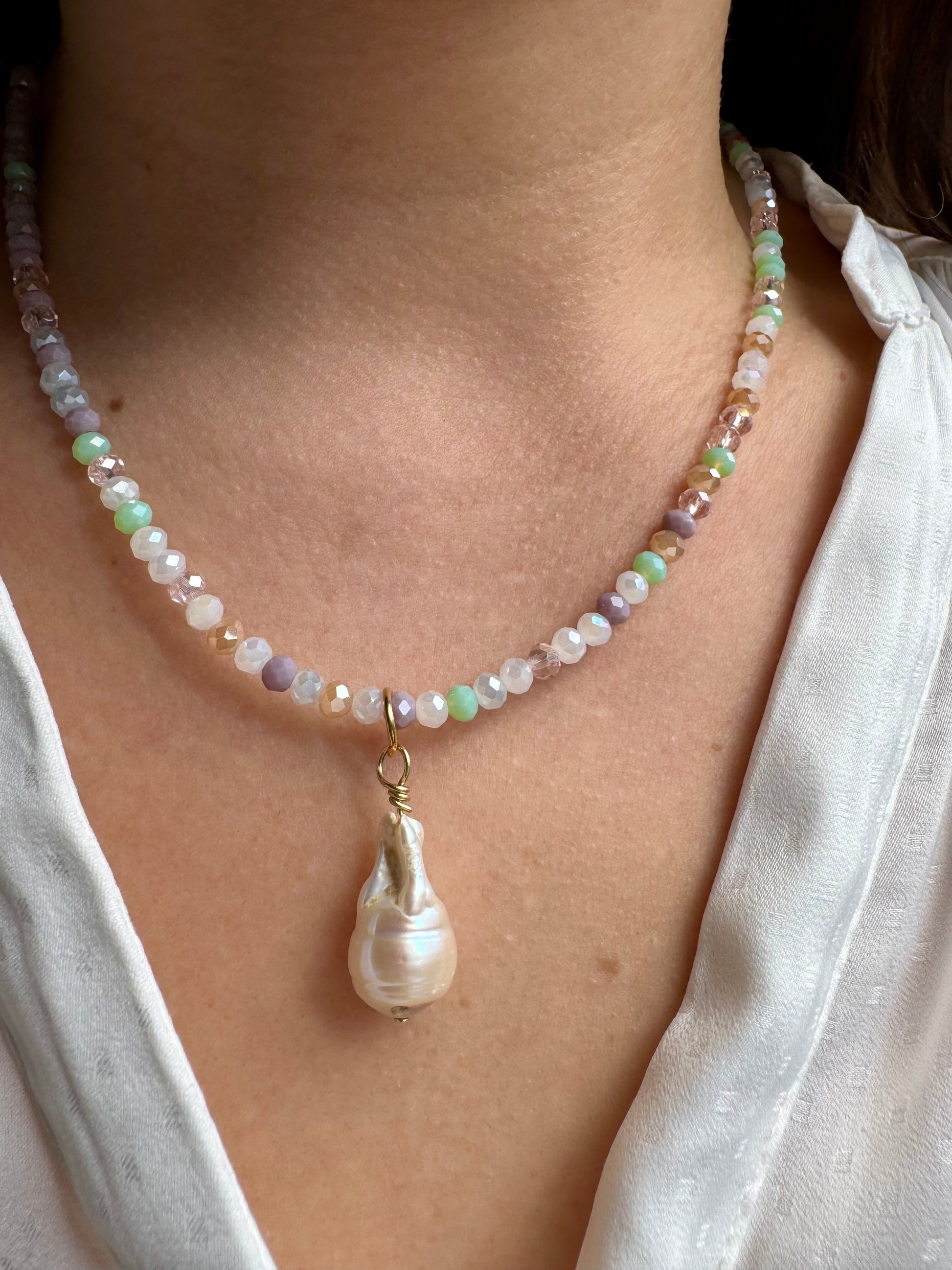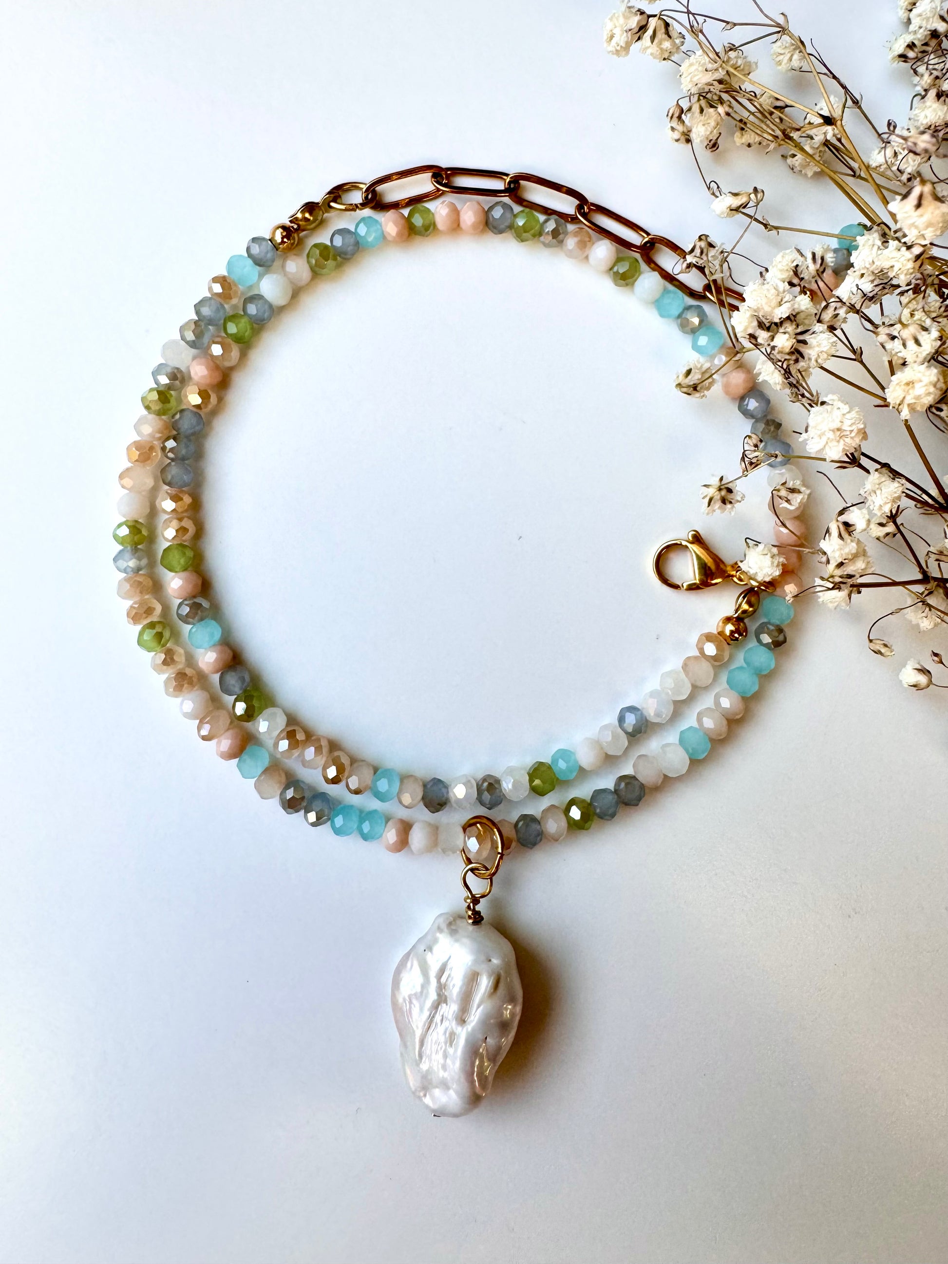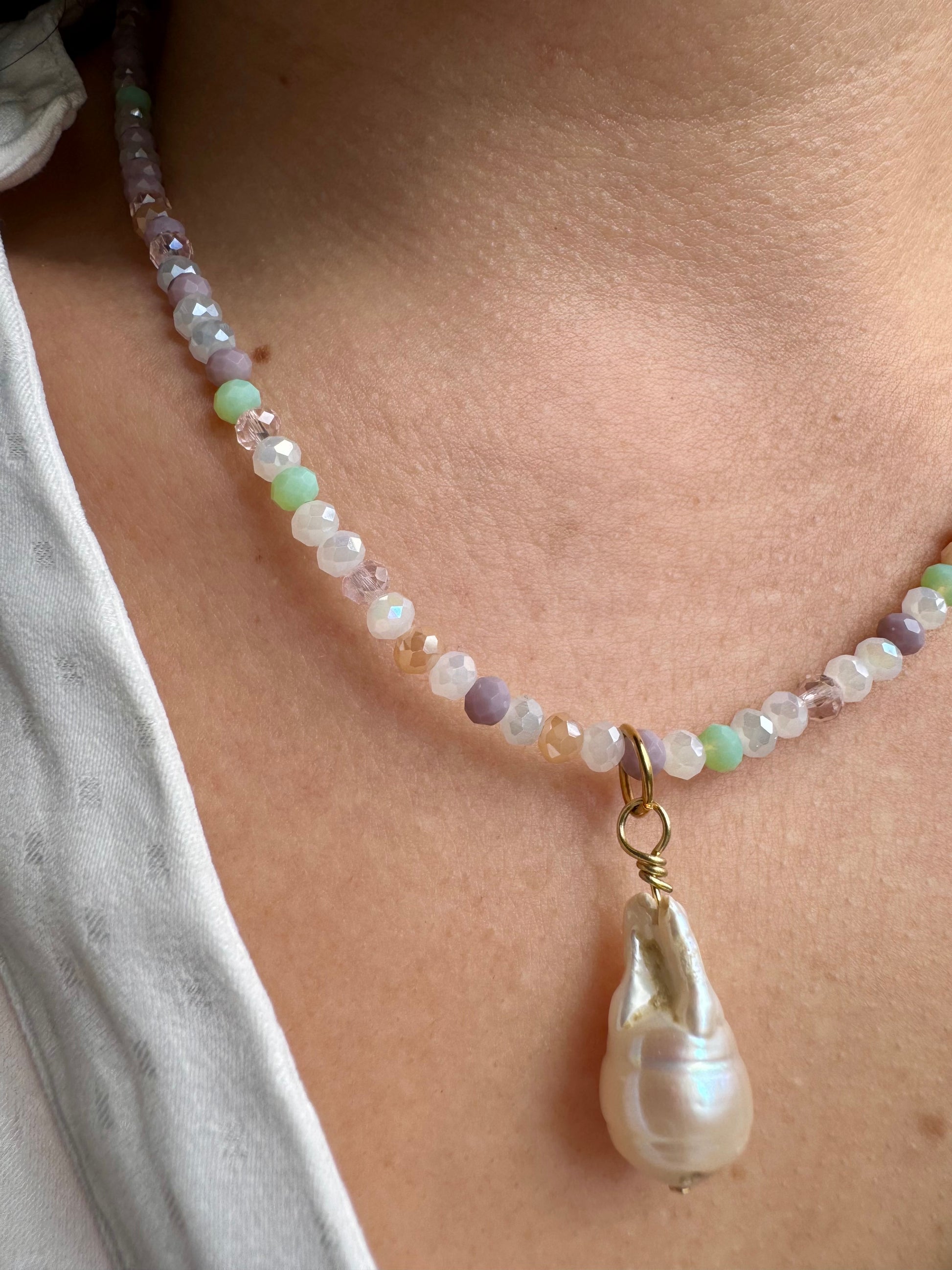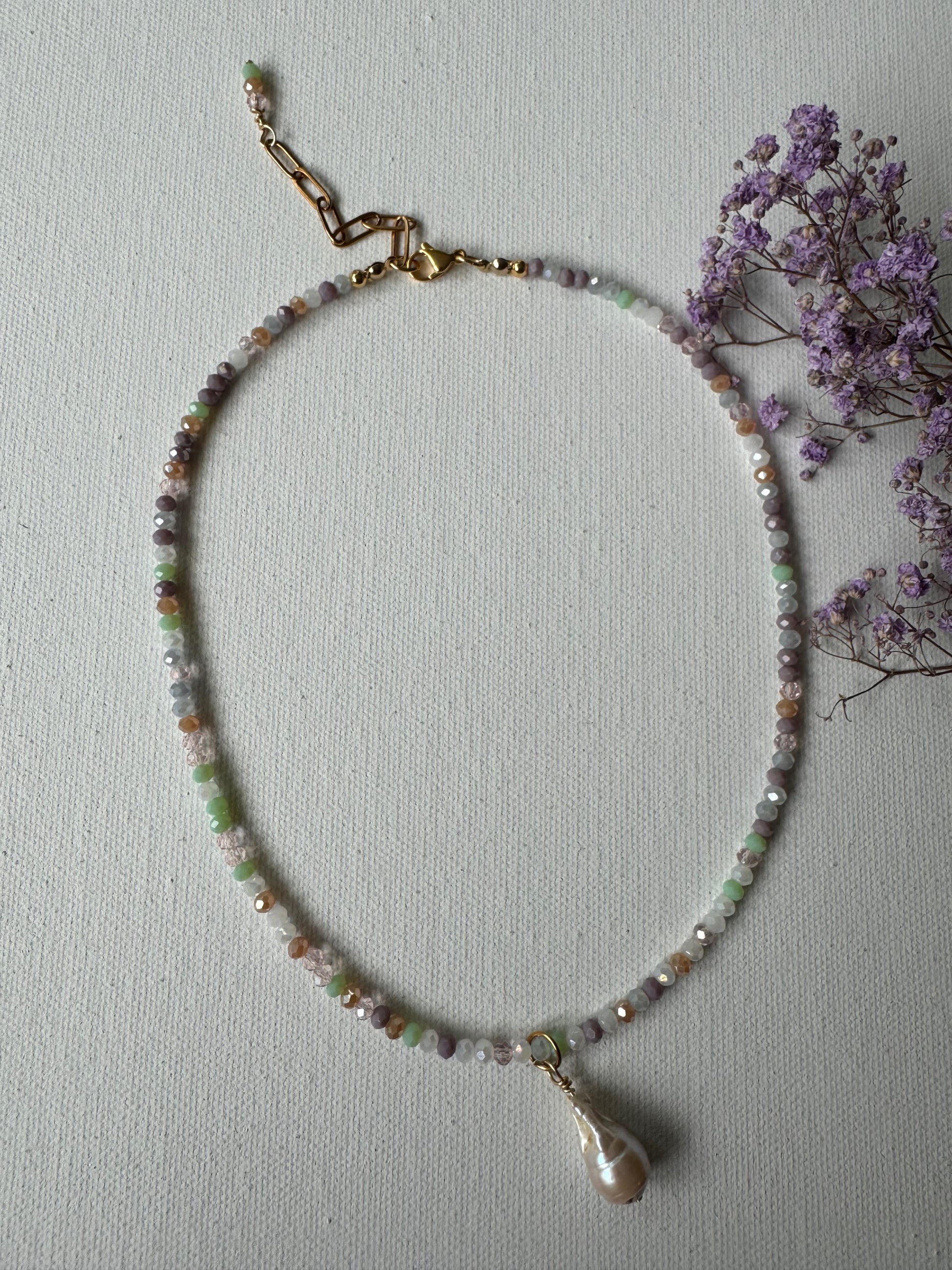 Pastellfarbene Edelstein-Halskette • Facettierte Glasperlen & Barockperle • 18k vergoldet