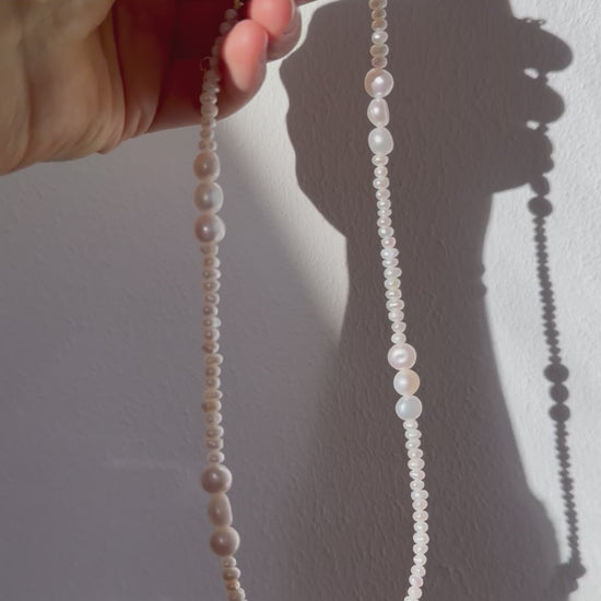 Pearl Essence steht für zeitlose Eleganz und feine Natürlichkeit. Zarte Süßwasserperlen treffen auf einzelne größere Akzentperlen und eine goldene Gliederverlängerung, die dem Design einen modernen Touch verleiht. Die Kombination aus filigranen 3–4 mm Perlen und ausdrucksstarken 8–9 mm Perlen schafft ein harmonisches Spiel aus Struktur und Größe. Eine klassische Kette mit besonderem Detail – perfekt für den Alltag, besondere Anlässe oder als stilvoller Brautschmuck.