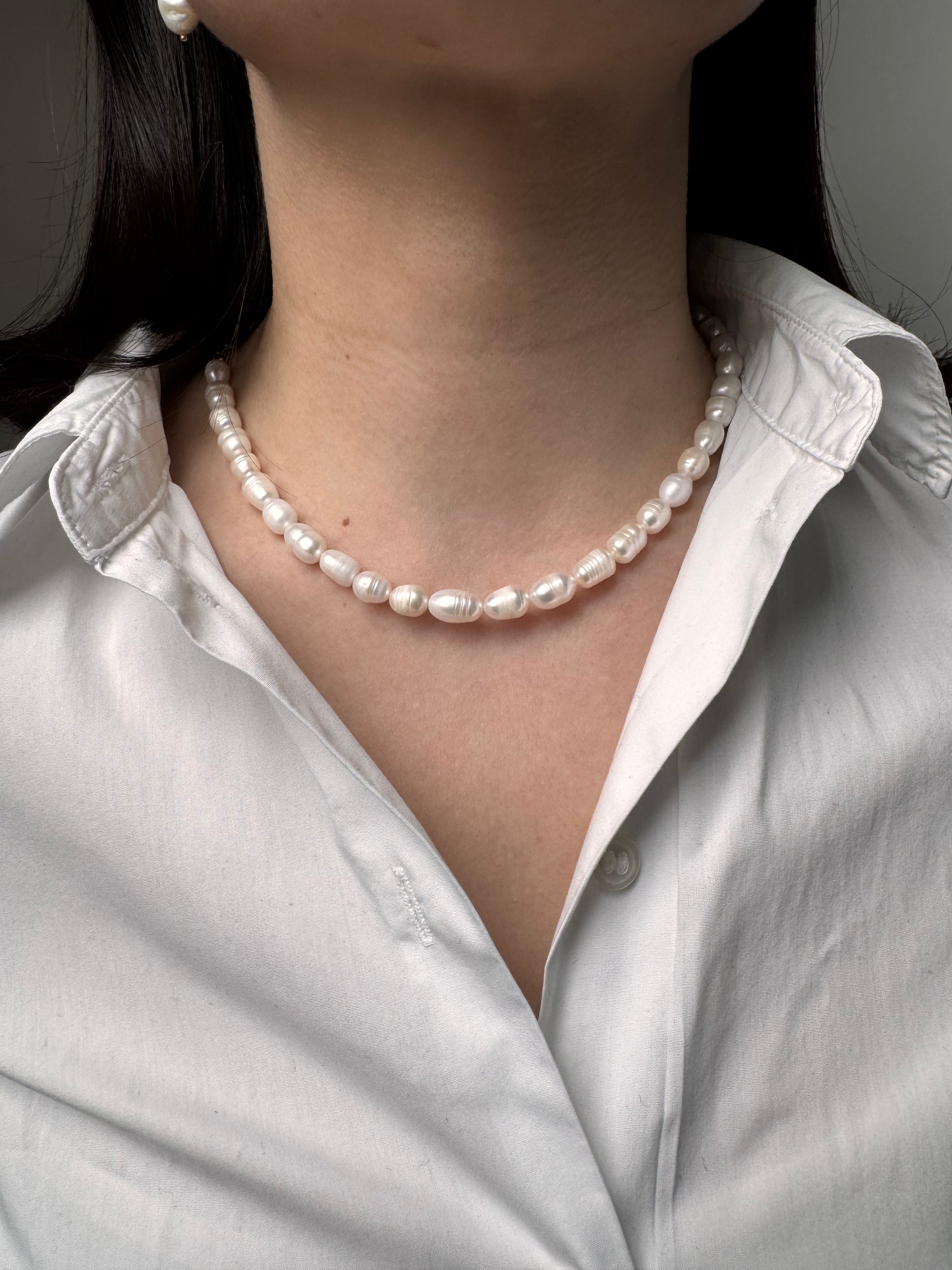 Diese elegante Perlenkette ist ein zeitloses Must-have für deinen Schmuckkasten. Die zarten, ovalen Süßwasserperlen verleihen jedem Look einen Hauch von Raffinesse – ob im Alltag oder zu besonderen Anlässen. Der hochwertige Knebelverschluss in 18k vergoldeter Optik rundet das klassische Design stilvoll ab und sorgt gleichzeitig für ein einfaches An- und Ablegen.