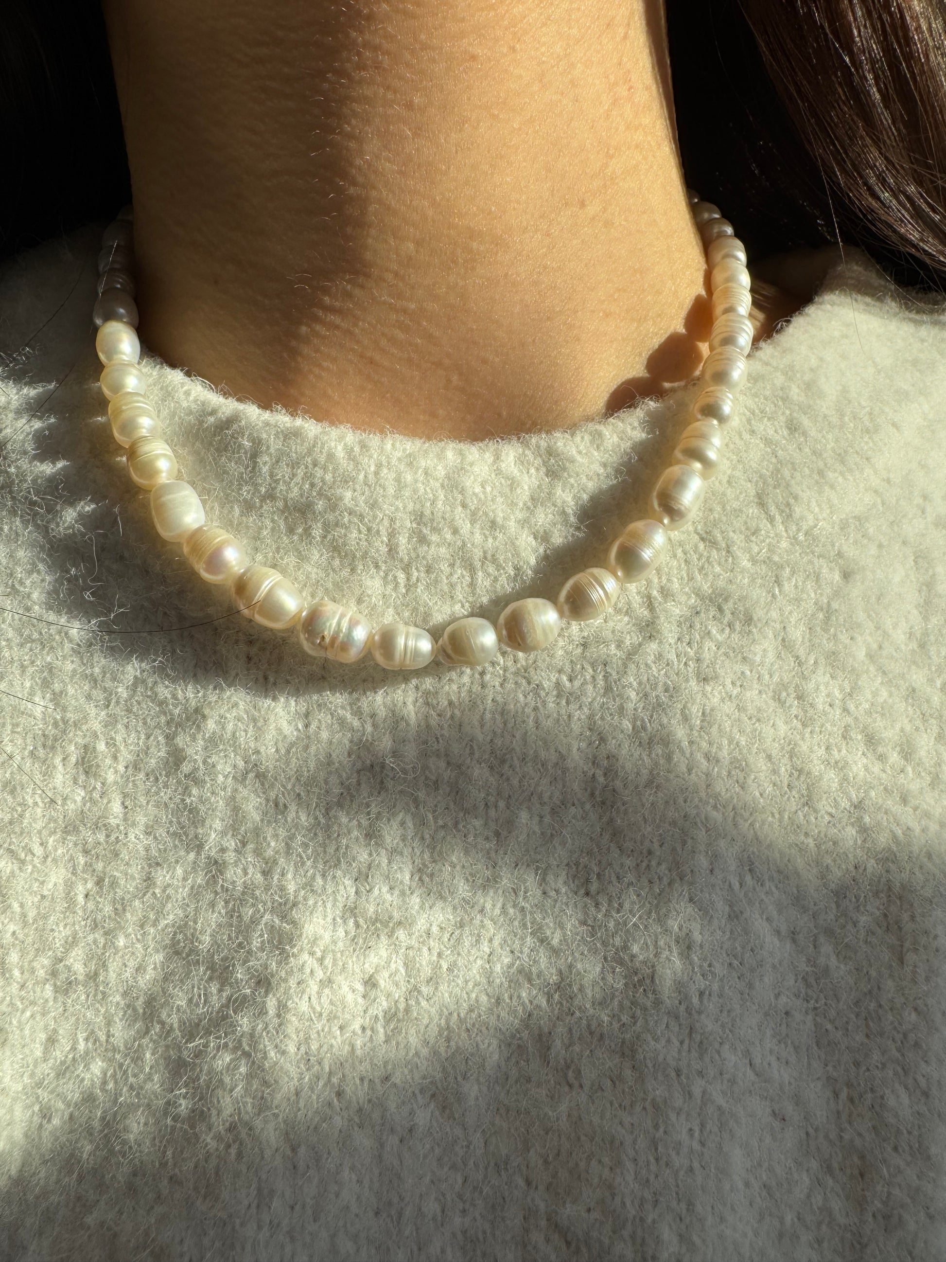 - Echte Süßwasserperlen (oval, ca. 6–7 mm)