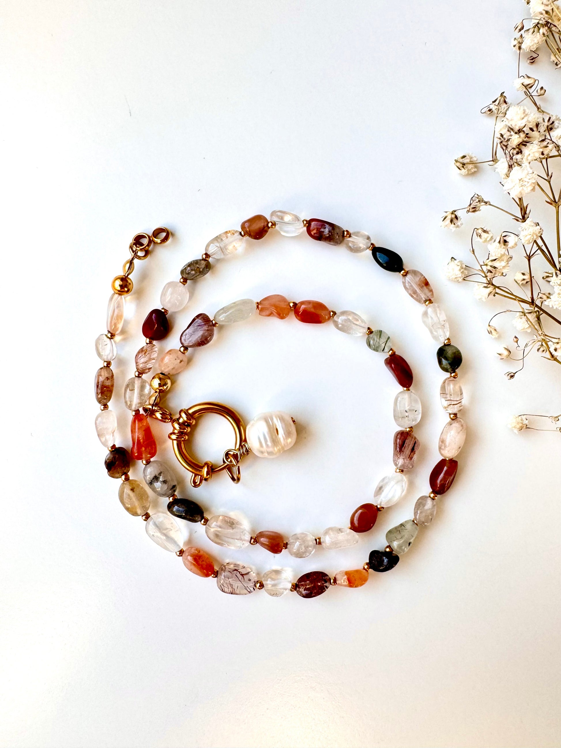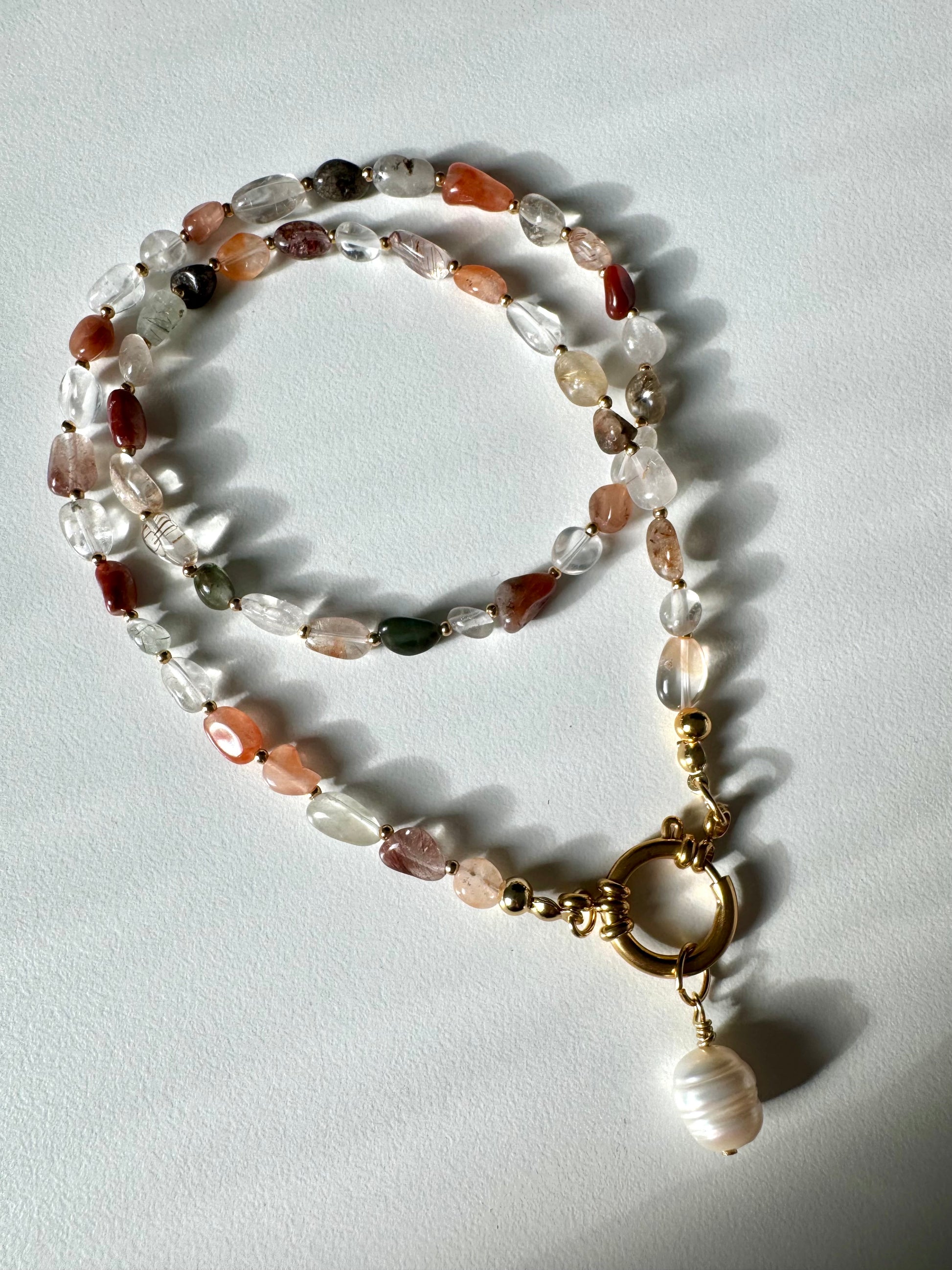 Diese edle Halskette vereint kleine Quarzsteine in natürlichen Farben mit goldenen Akzenten und einer großen Barockperle als Anhänger. Der massive Karabinerring dient nicht nur als Verschluss, sondern auch als modernes Design-Highlight. Besonders praktisch: Die Kette lässt sich mit oder ohne Perlenanhänger tragen – und passt sich damit flexibel deinem Stil an.