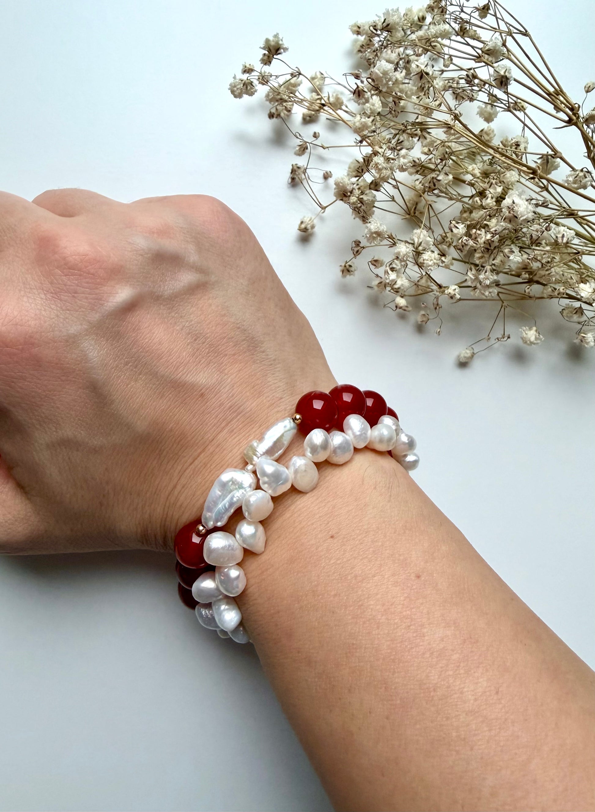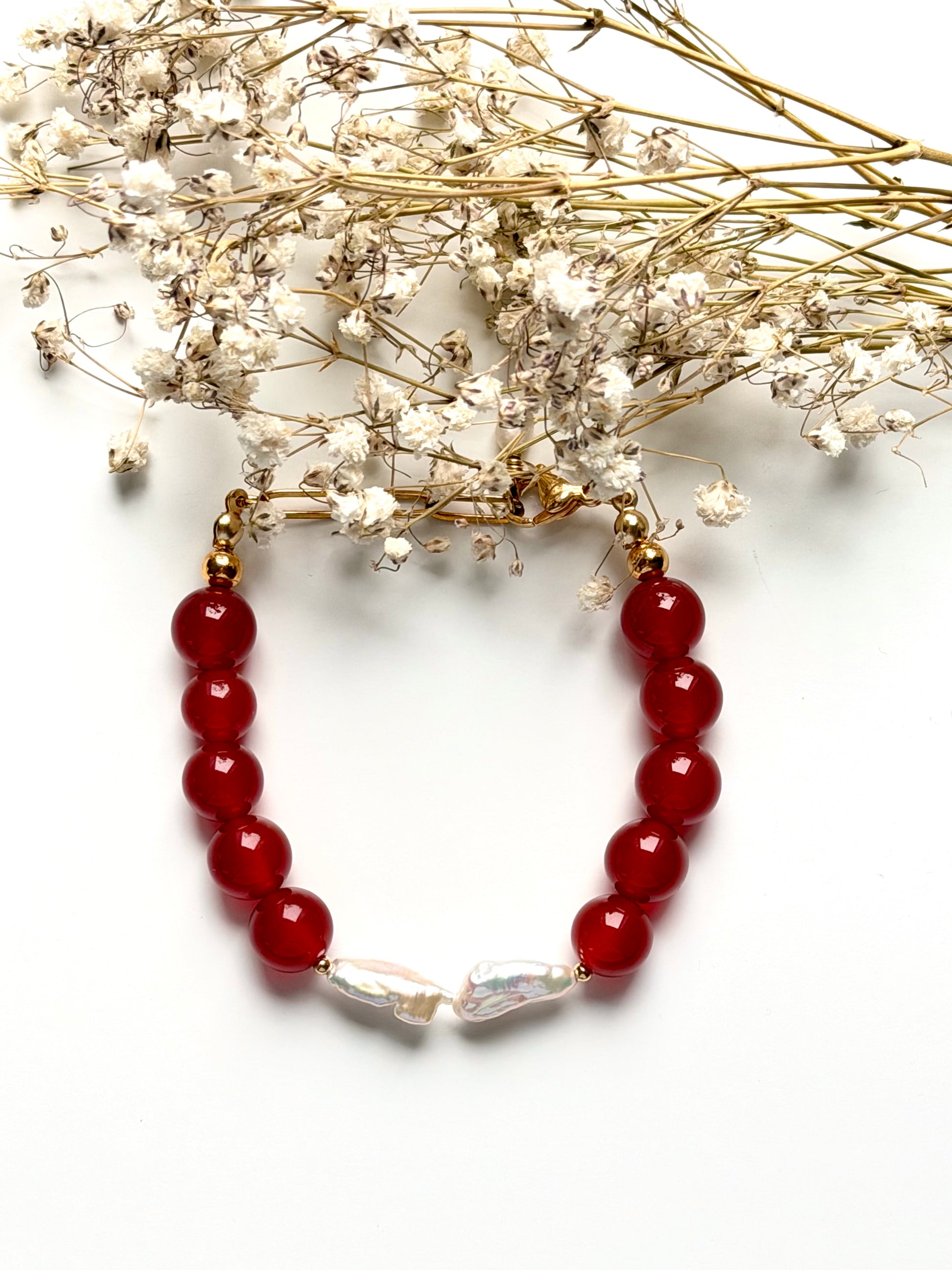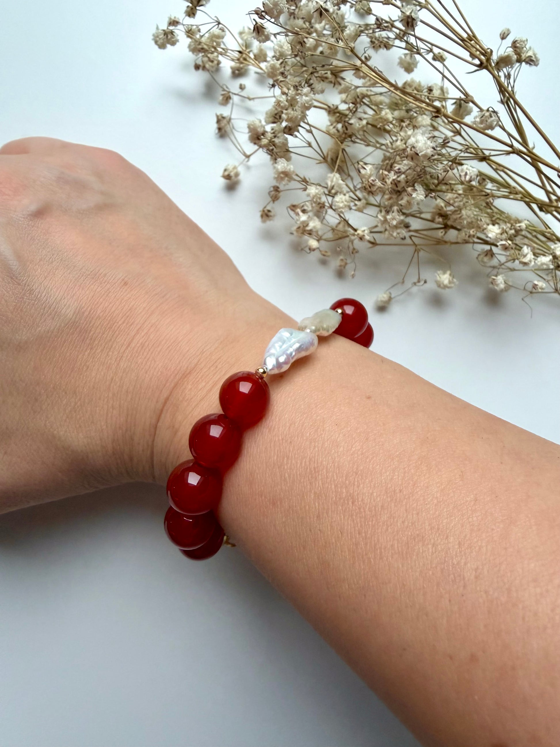 Red Lady – Armband aus rotem Achat mit Süßwasserperlen – handgefertigt