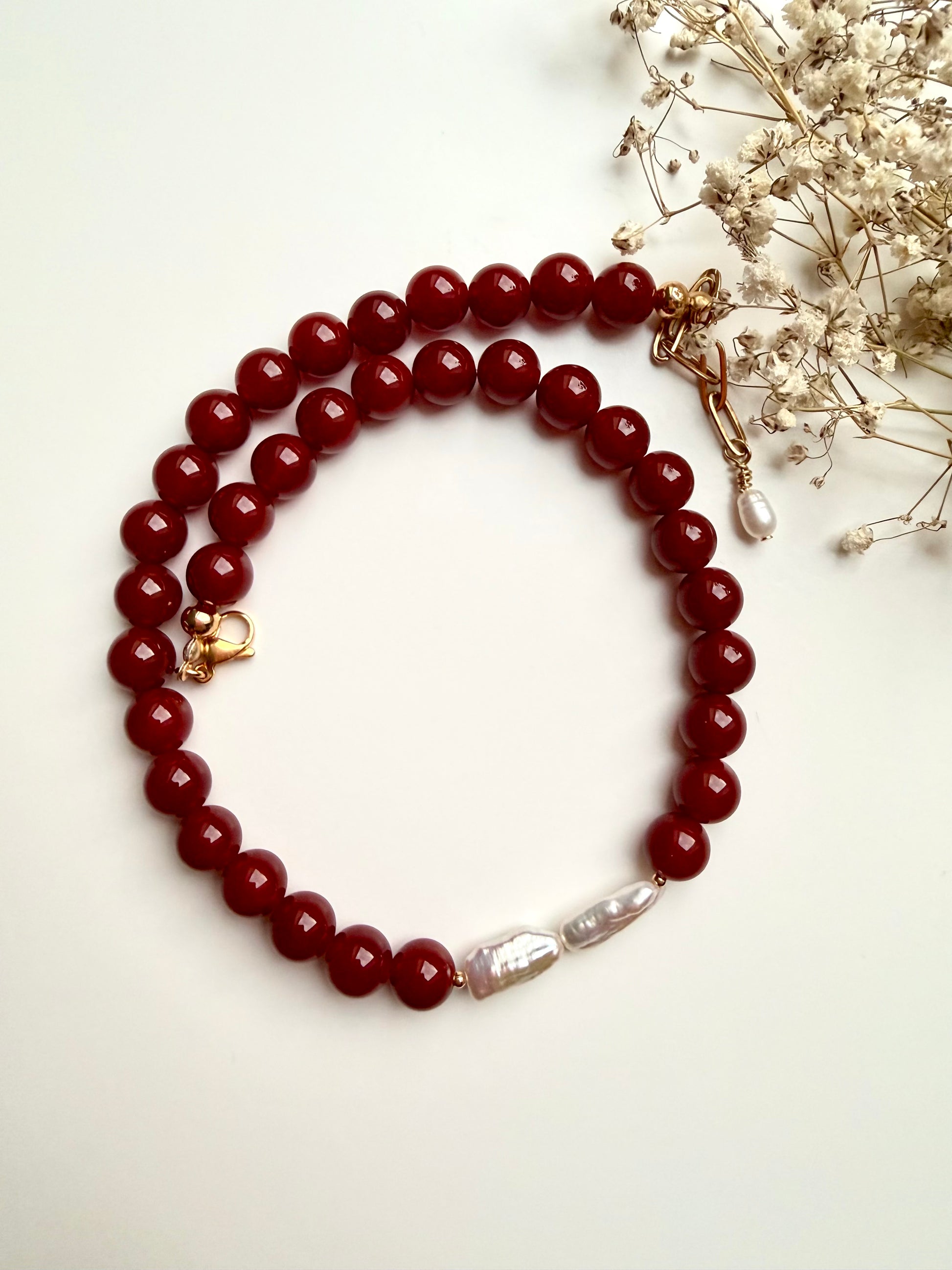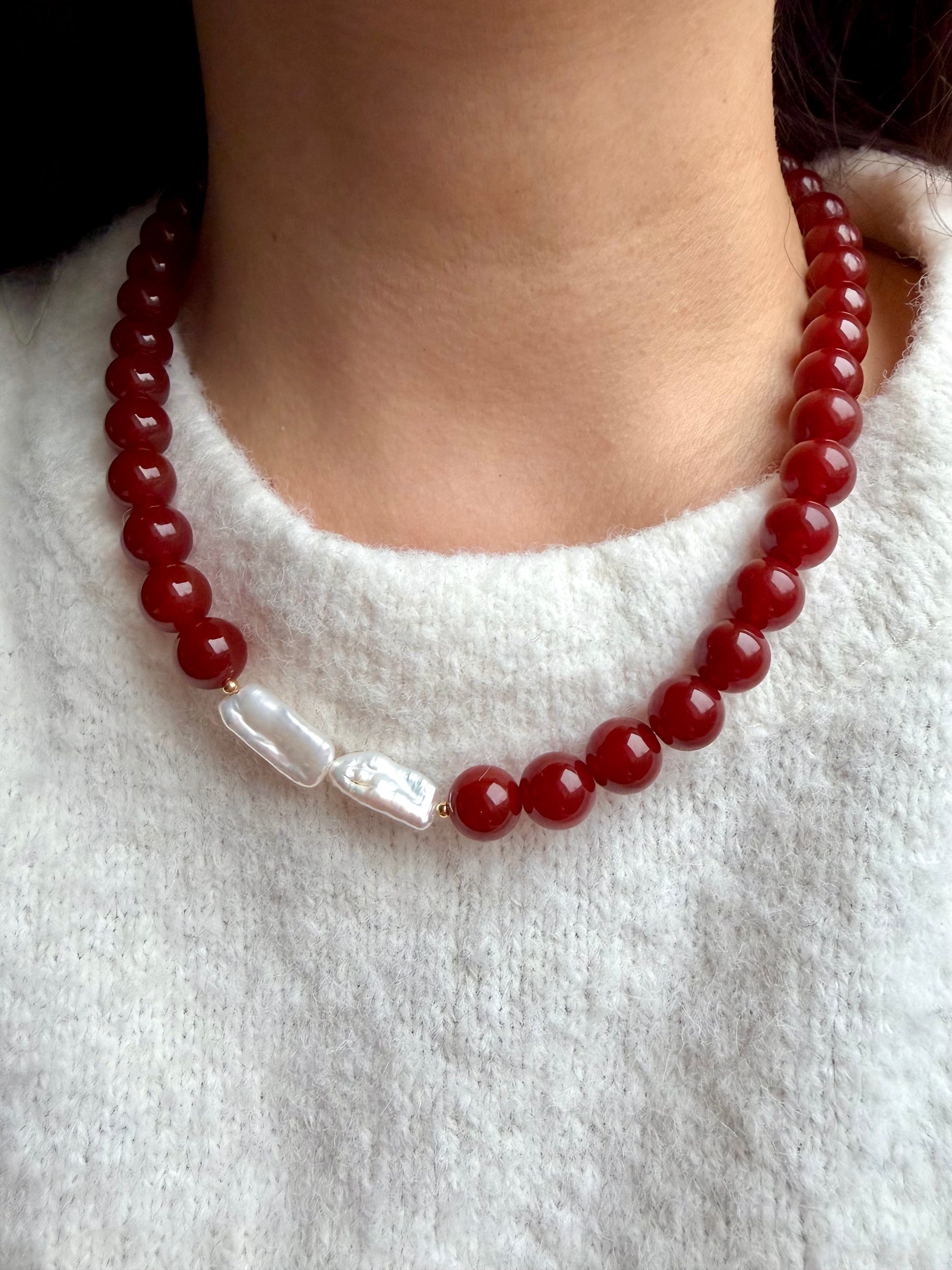 - Material: Roter Achat (rund, poliert), natürliche Süßwasserperlen