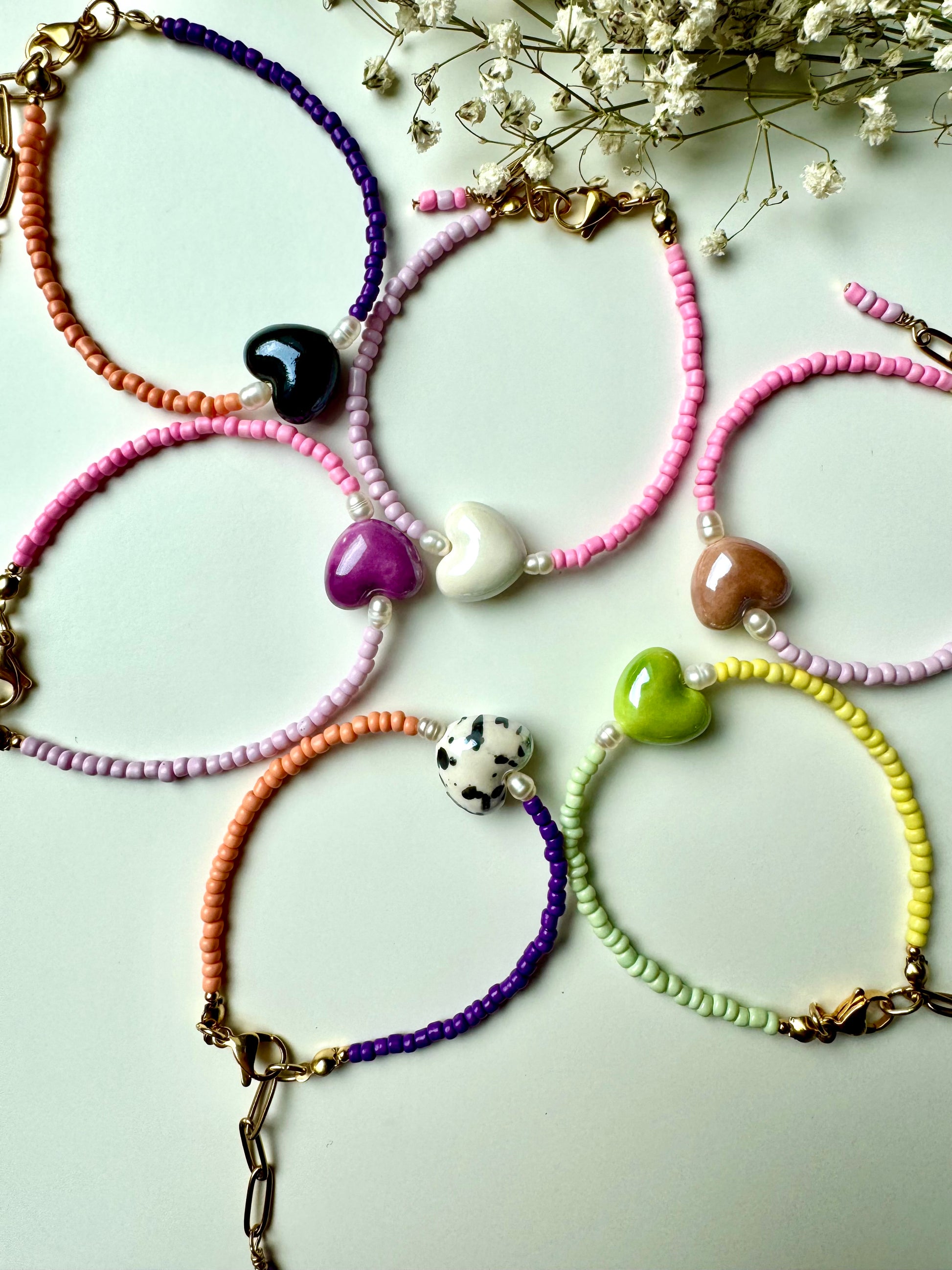 Dieses zarte Armband vereint feinste Miyuki-Perlen in sanften Rosa- und Fliedertönen mit einem eleganten Herzanhänger aus Keramik. Ergänzt durch schimmernde Süßwasserperlen entsteht ein femininer, verspielter Look, der jedes Handgelenk stilvoll schmückt – ideal als liebevolles Geschenk oder als Statement für den Alltag.