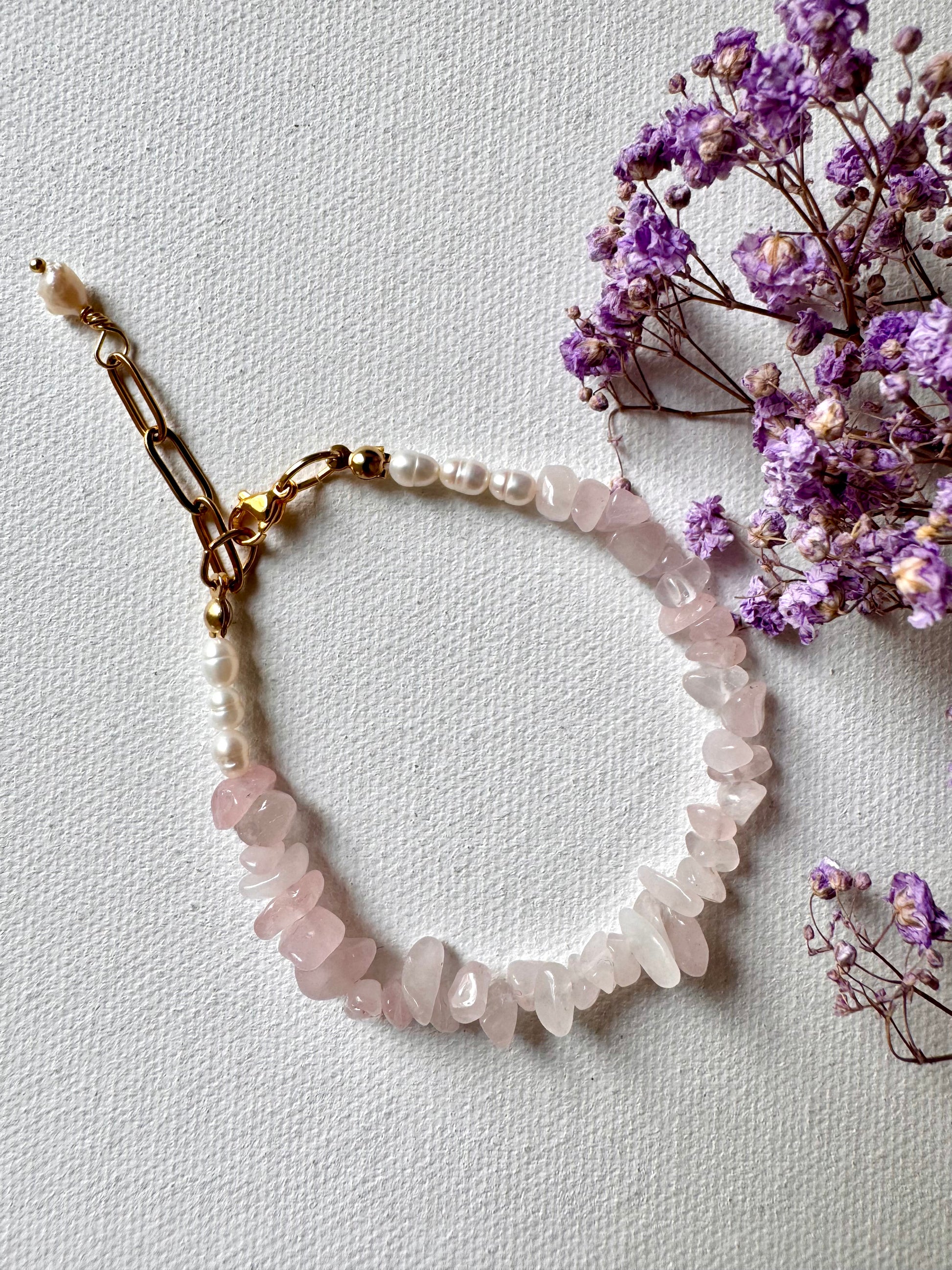 Rose Quartz Pearl Bracelet – zartes Armband mit Rosenquarz-Splittersteinen, Süßwasserperlen & Gold