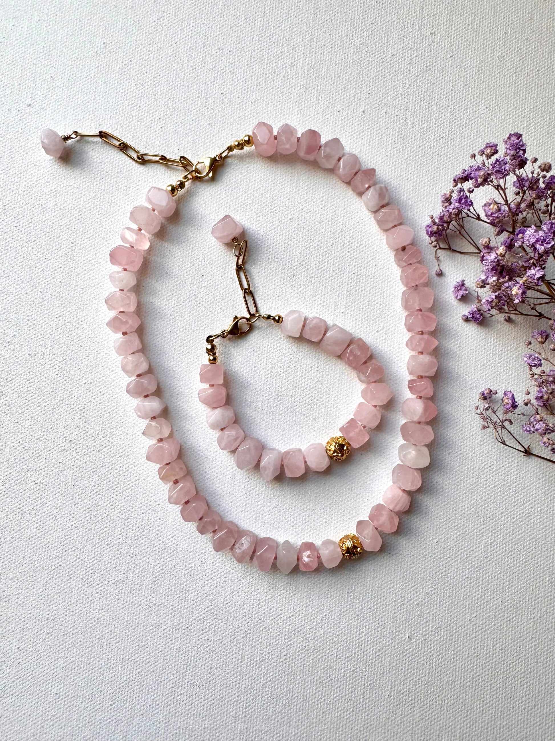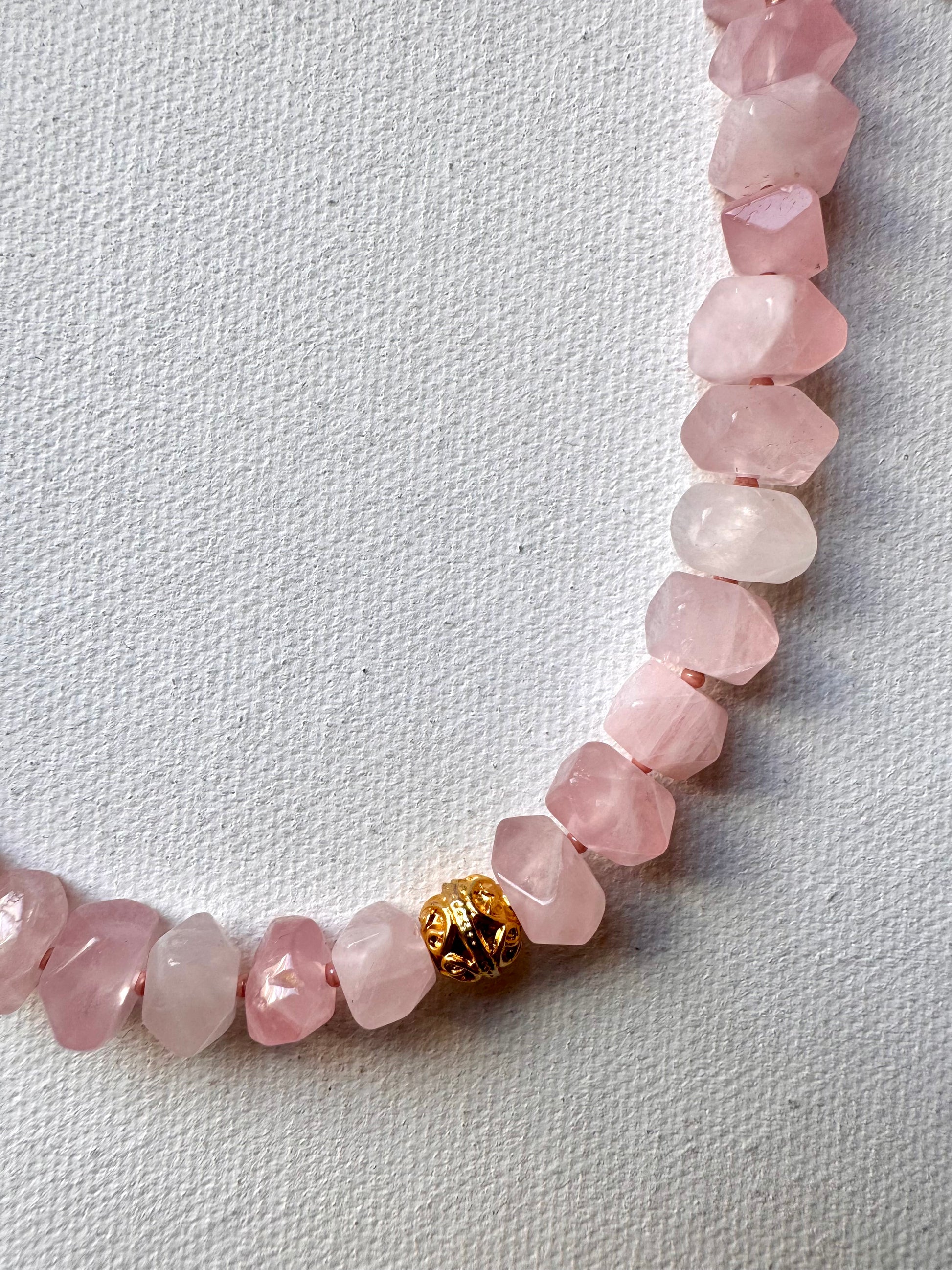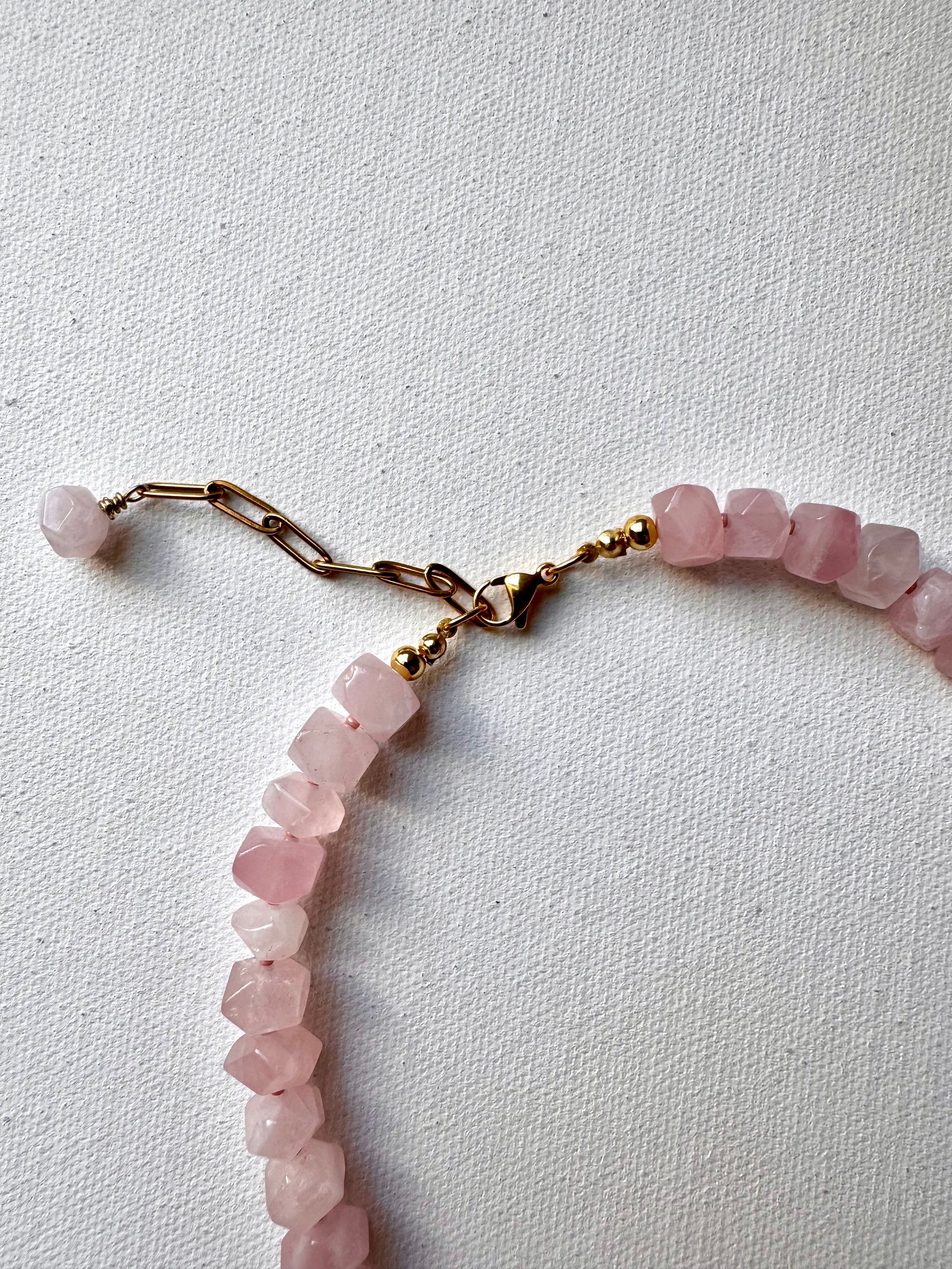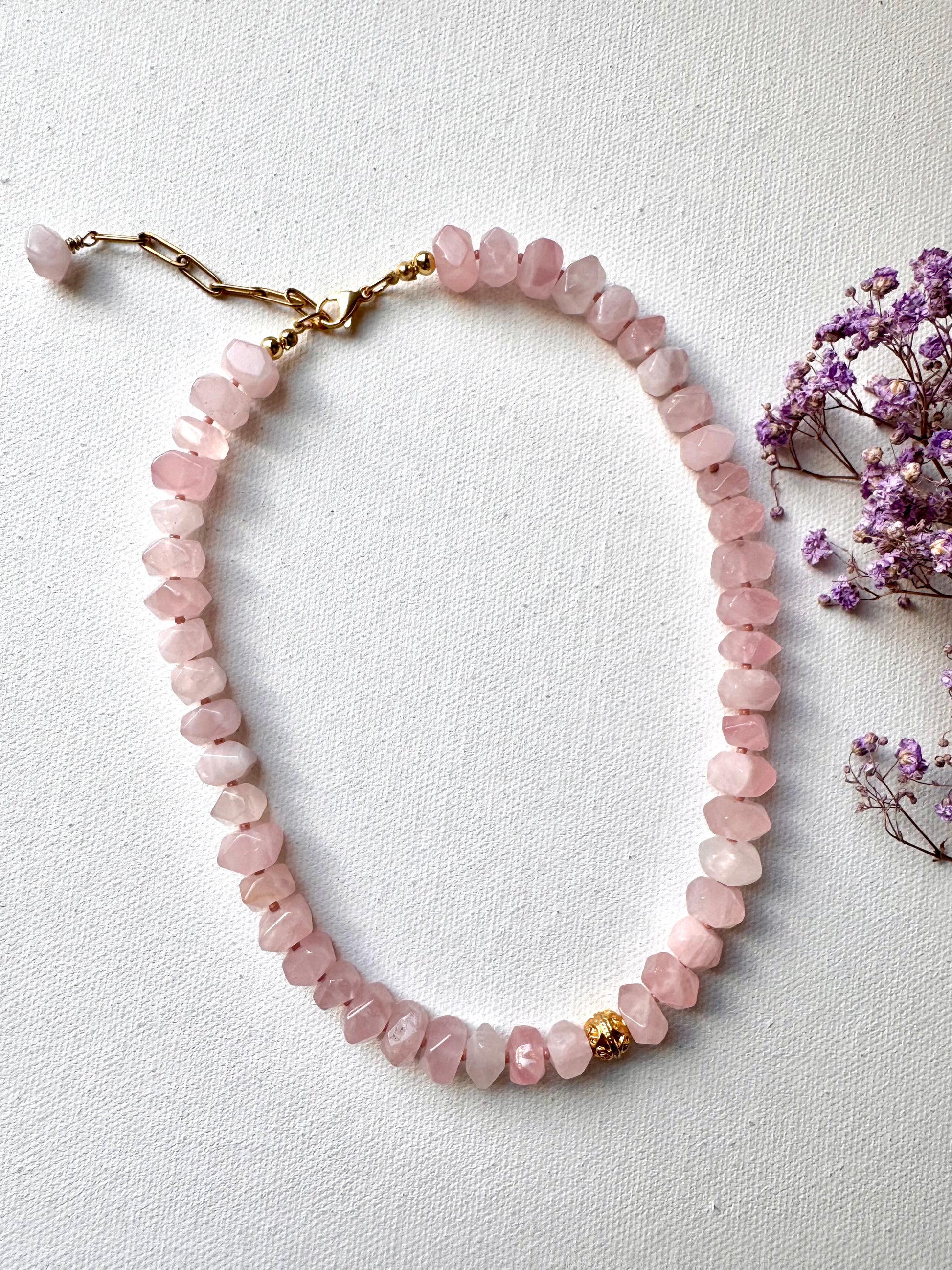 Rosenquarz-Halskette mit facettierten Edelsteinperlen & goldener Akzentperle