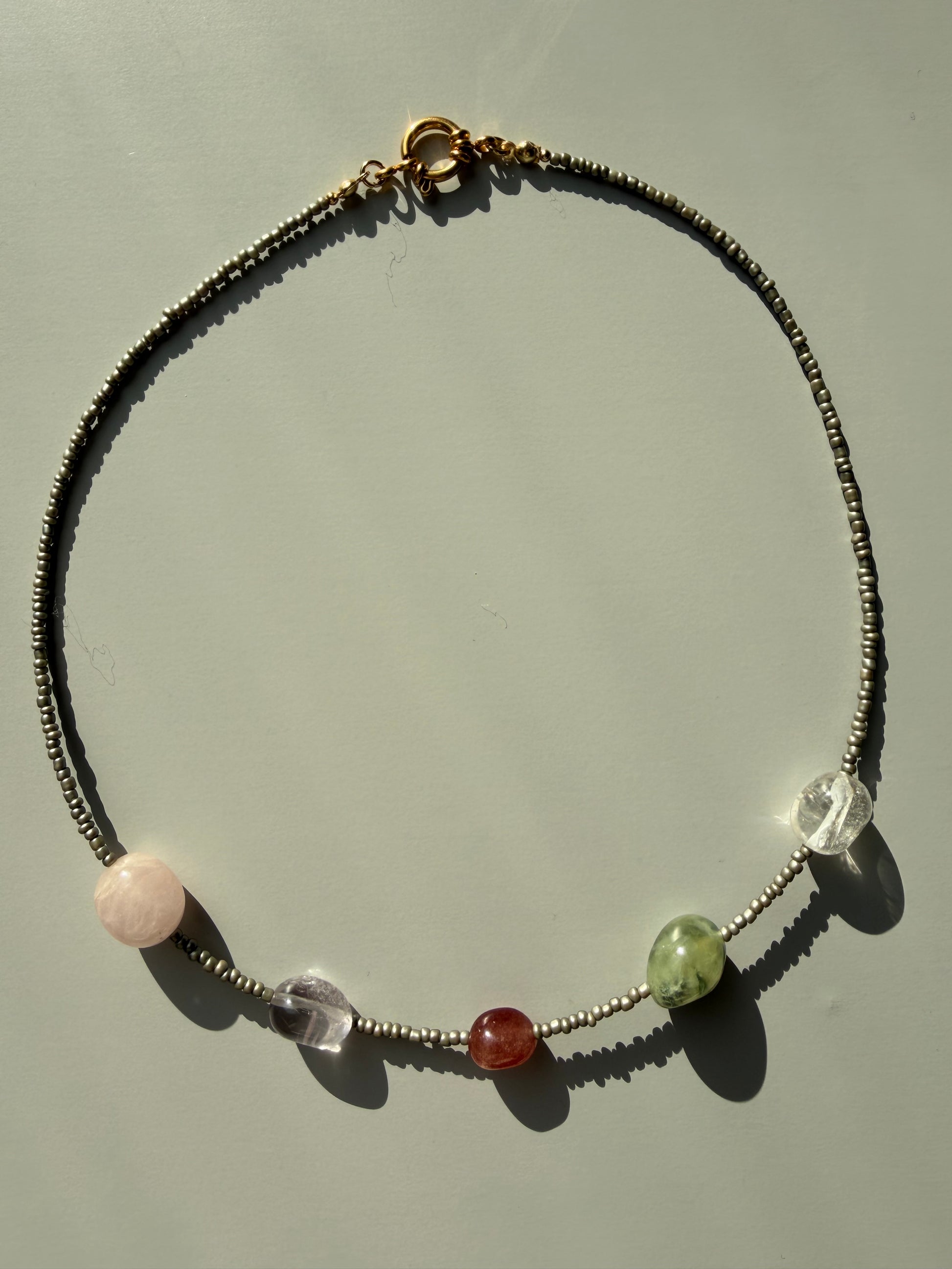 Stone Balance – Edelstein Kette mit Rosenquarz, Bergkristall, Prehnit & Sonnenstein – handgefertigt