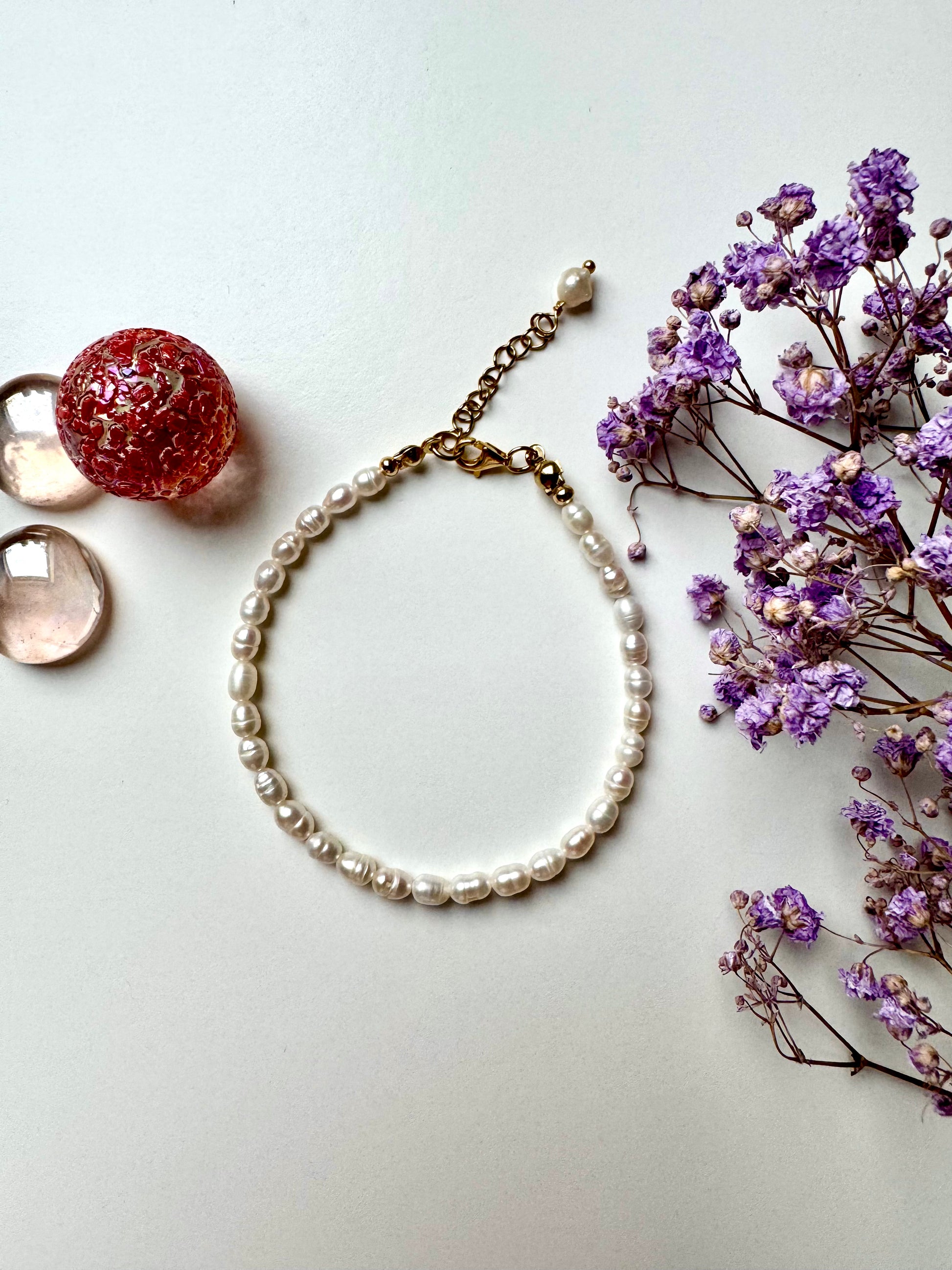 Dieses zarte Armband besteht aus edlen, natürlichen Süßwasserperlen, die in ihrer unregelmäßigen Form jedem Stück eine individuelle Note verleihen. Die Kombination mit vergoldeten Details verleiht dem Schmuckstück eine elegante Ausstrahlung – perfekt für Alltag und besondere Anlässe. Dank der Verlängerungskette lässt sich das Armband flexibel an dein Handgelenk anpassen.