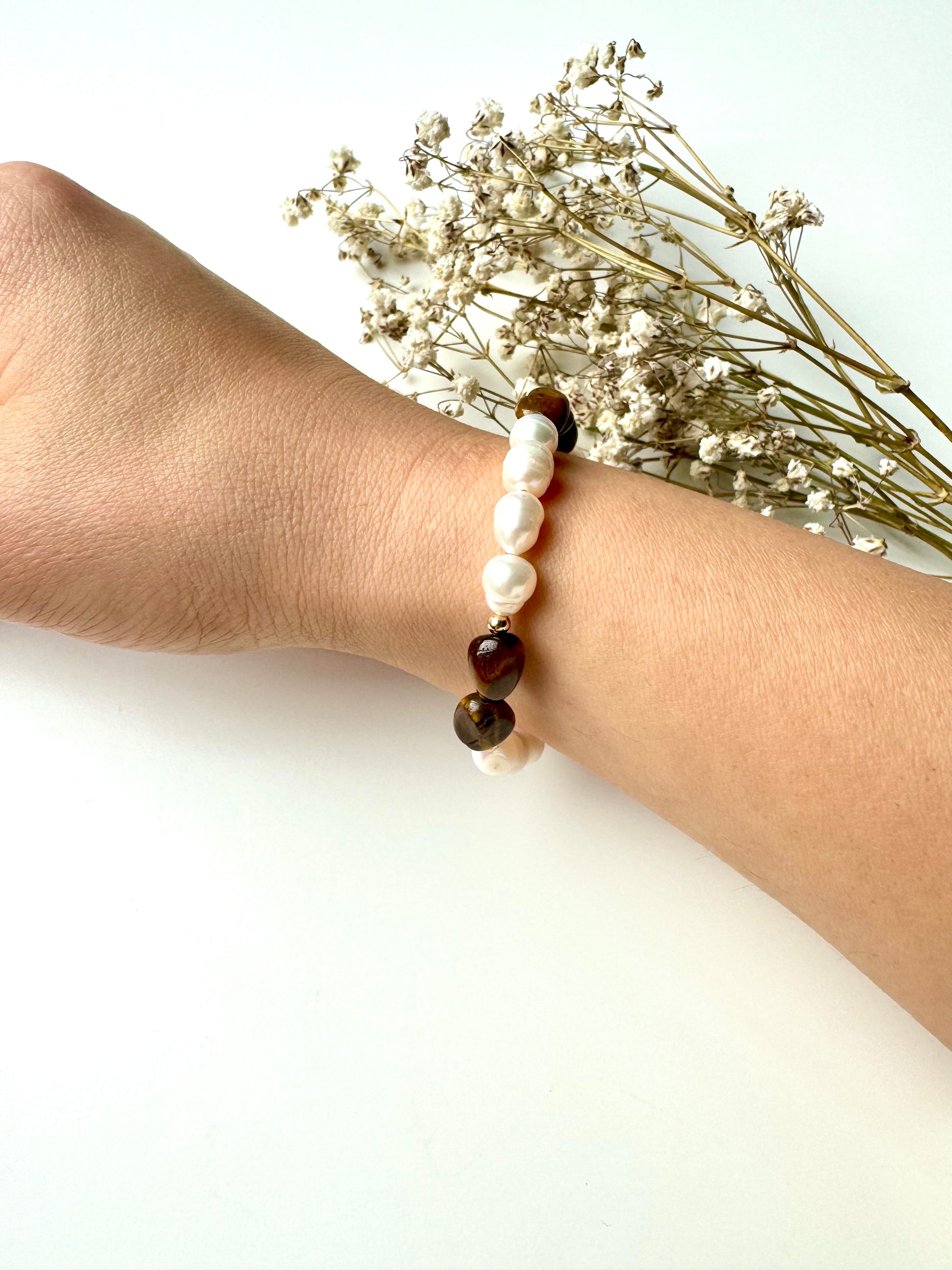 TOFFEE PEARL – Armband mit Süßwasserperlen & Tigerauge-Steinen, 18k vergoldet, handgefertigt