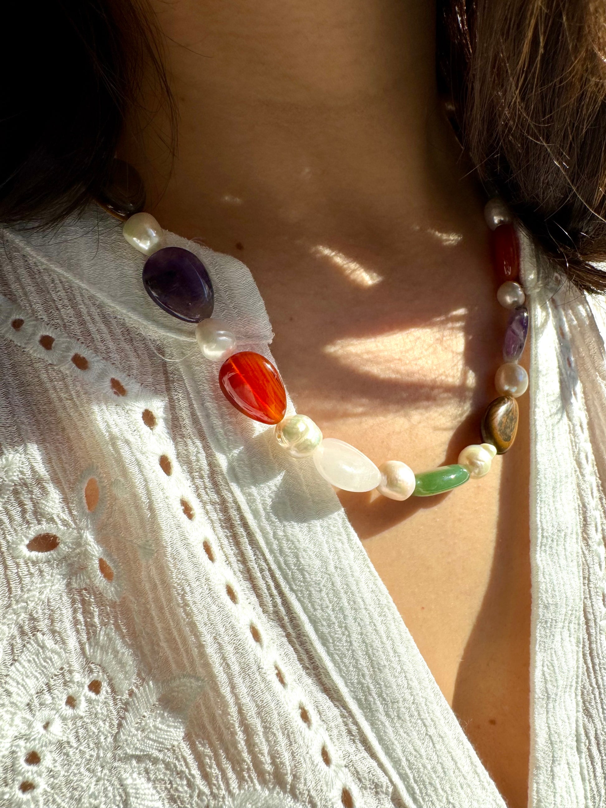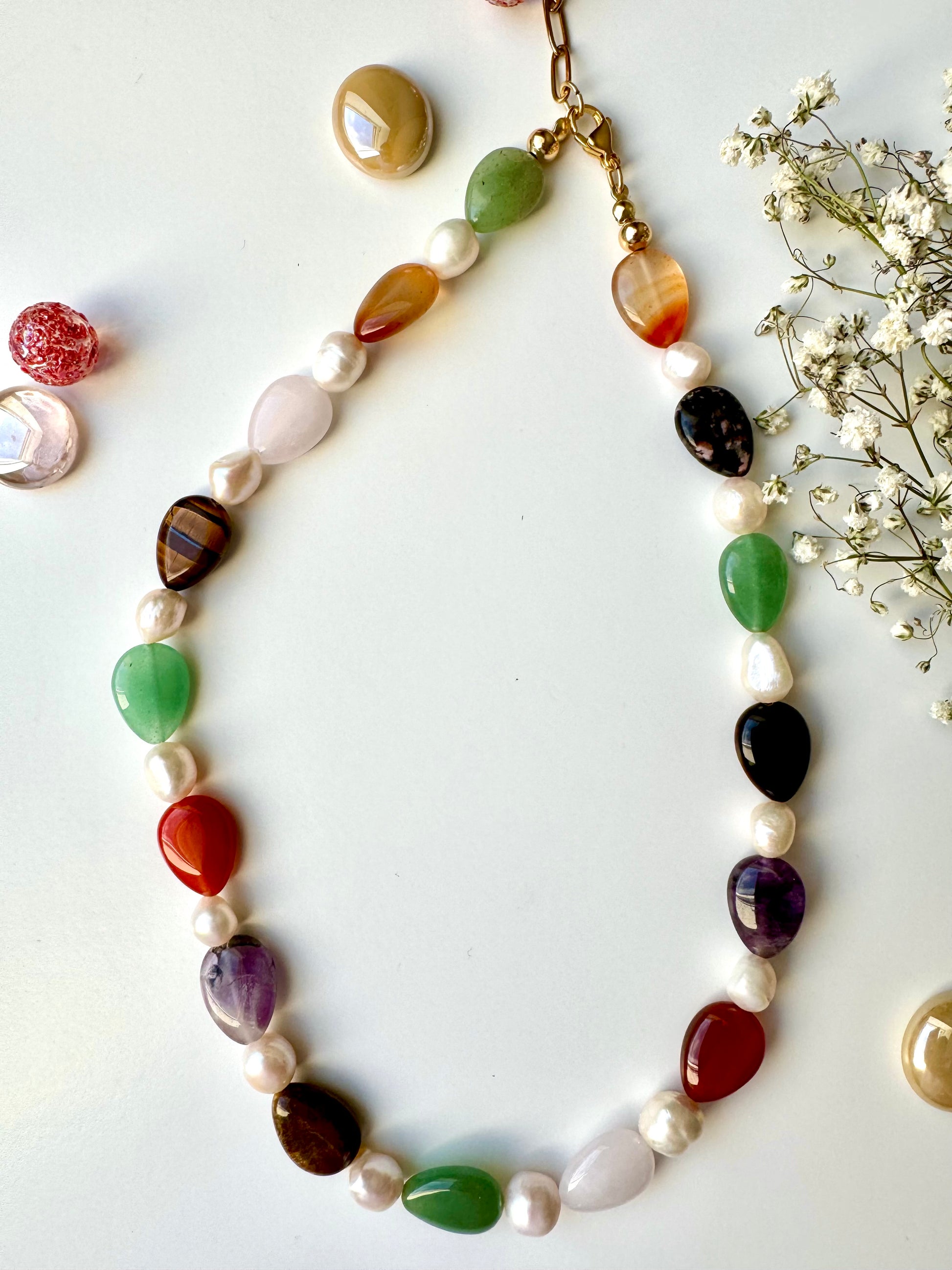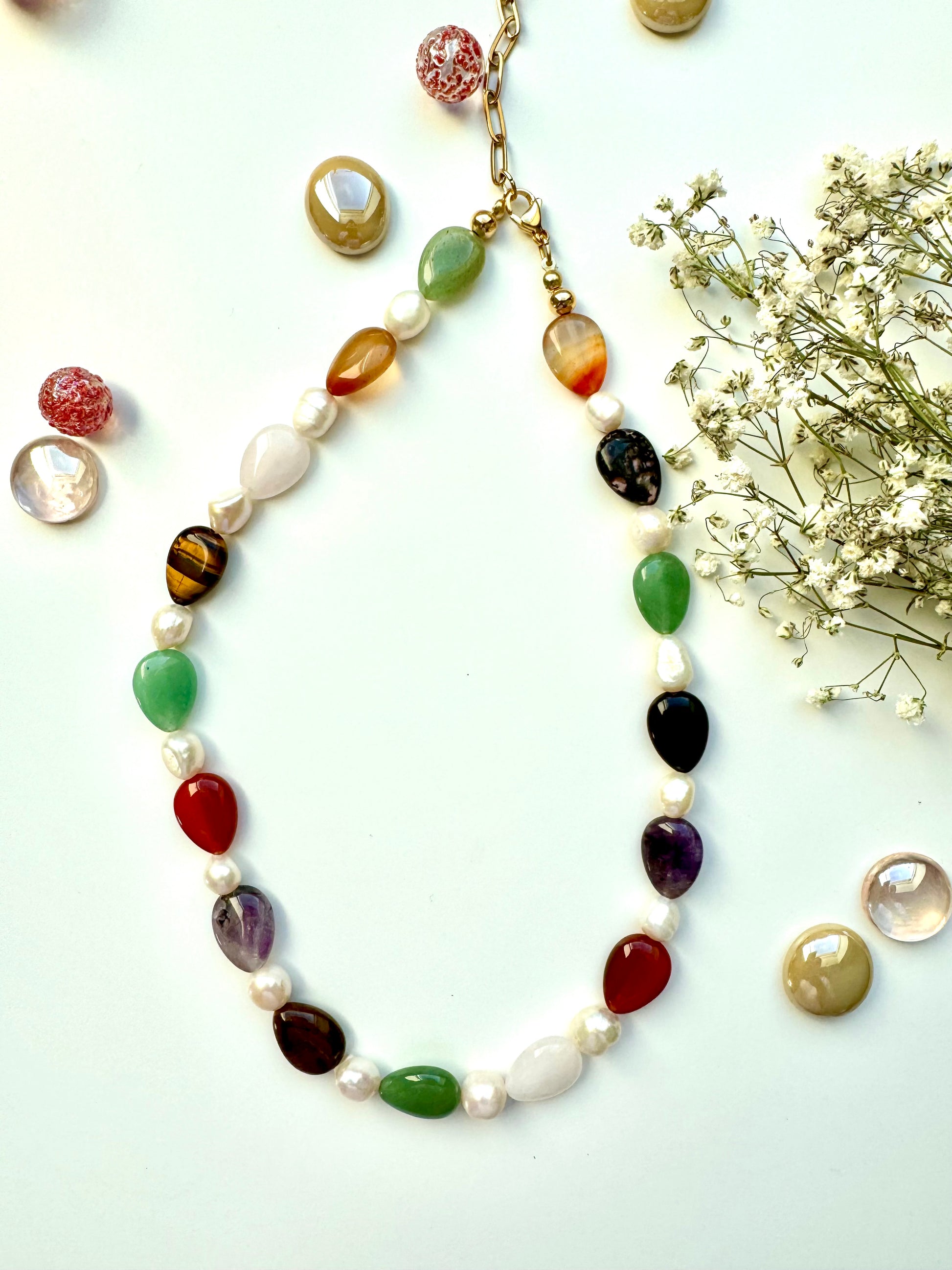 Diese farbenfrohe Halskette vereint natürliche Edelstein-Cabochons in Tropfenform mit edlen Süßwasserperlen. Jeder Stein bringt seine eigene Farbe und Struktur mit – von zarten Grüntönen über kräftiges Rot bis hin zu sanftem Violett. Die harmonische Kombination aus schimmernden Perlen und Edelsteinen macht diese Halskette zu einem ausdrucksstarken Begleiter für besondere Anlässe und den Alltag.