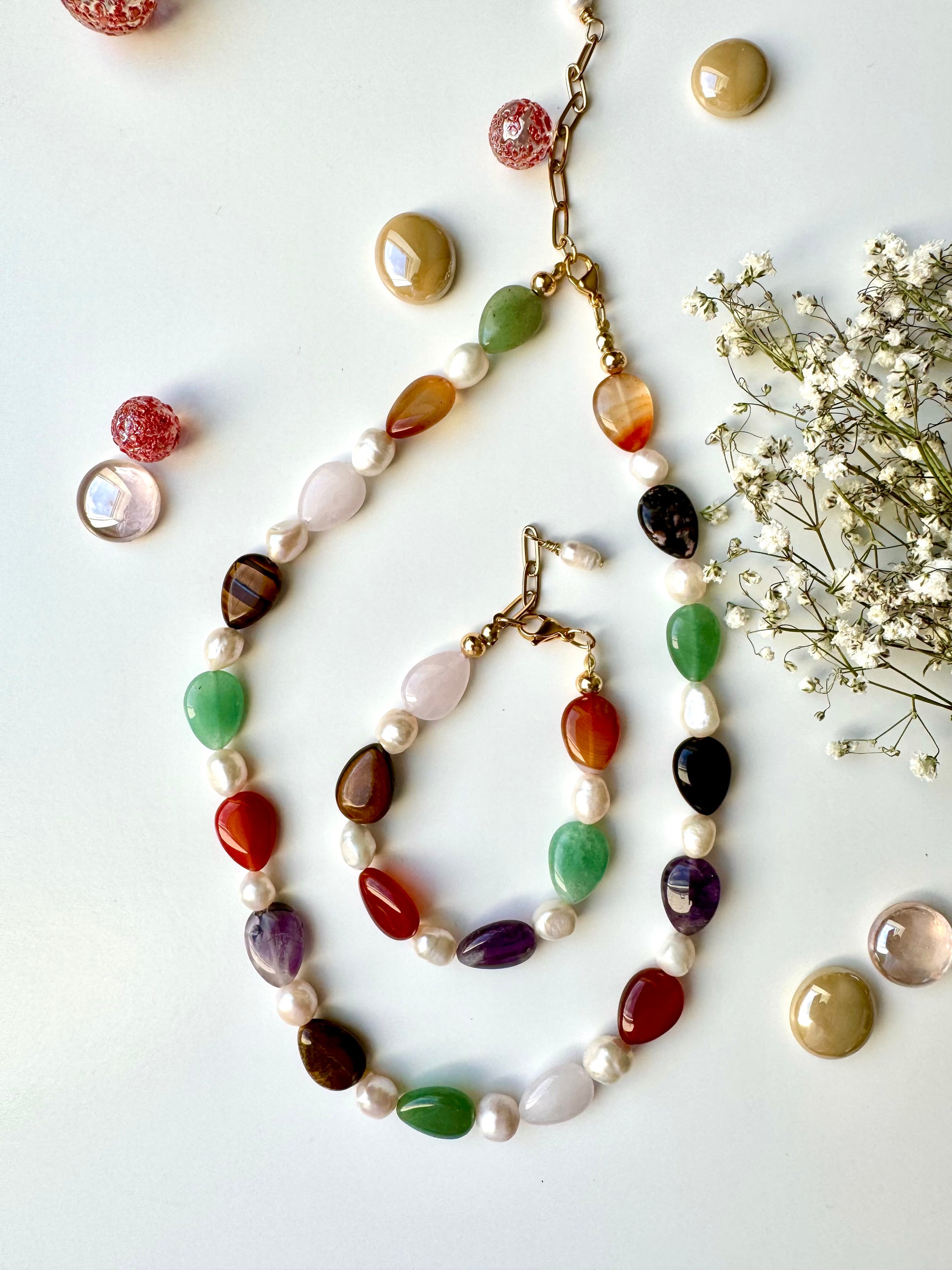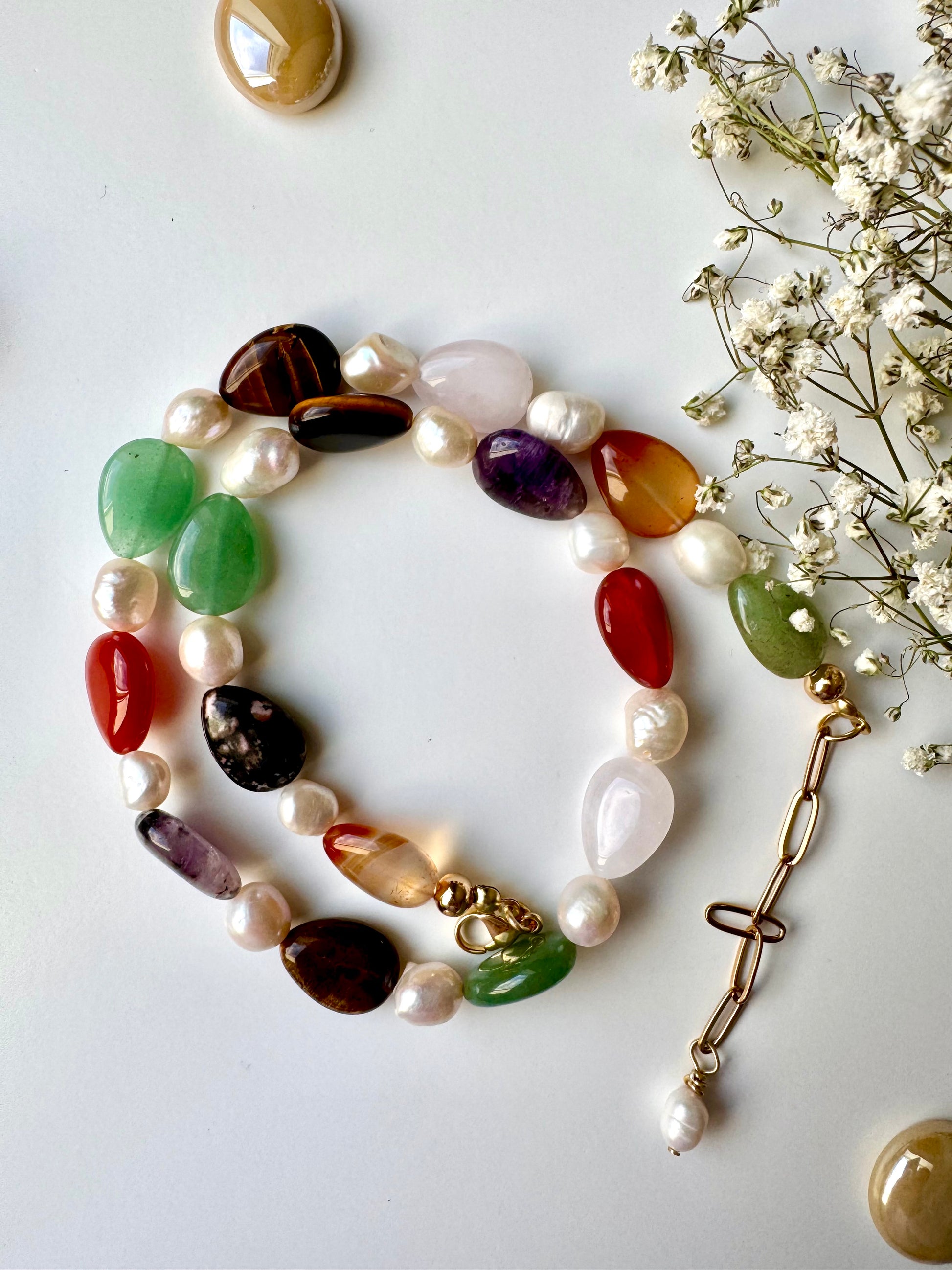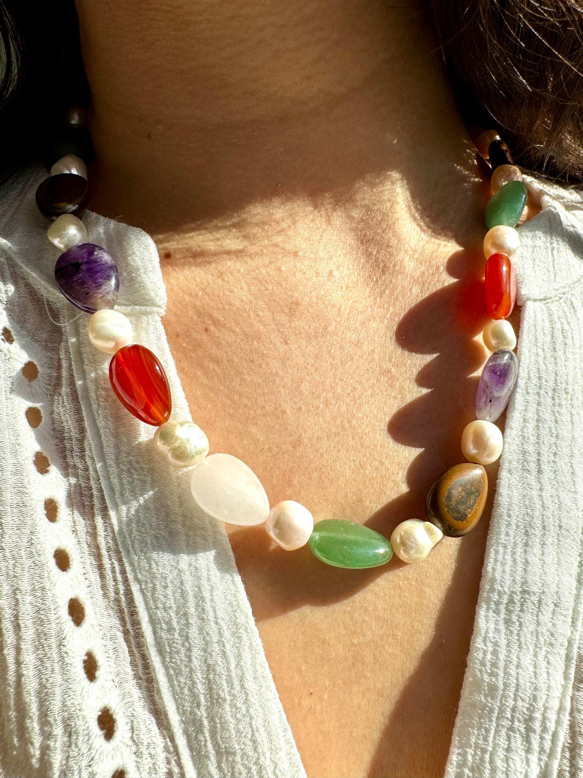 Diese farbenfrohe Halskette vereint natürliche Edelstein-Cabochons in Tropfenform mit edlen Süßwasserperlen. Jeder Stein bringt seine eigene Farbe und Struktur mit – von zarten Grüntönen über kräftiges Rot bis hin zu sanftem Violett. Die harmonische Kombination aus schimmernden Perlen und Edelsteinen macht diese Halskette zu einem ausdrucksstarken Begleiter für besondere Anlässe und den Alltag.