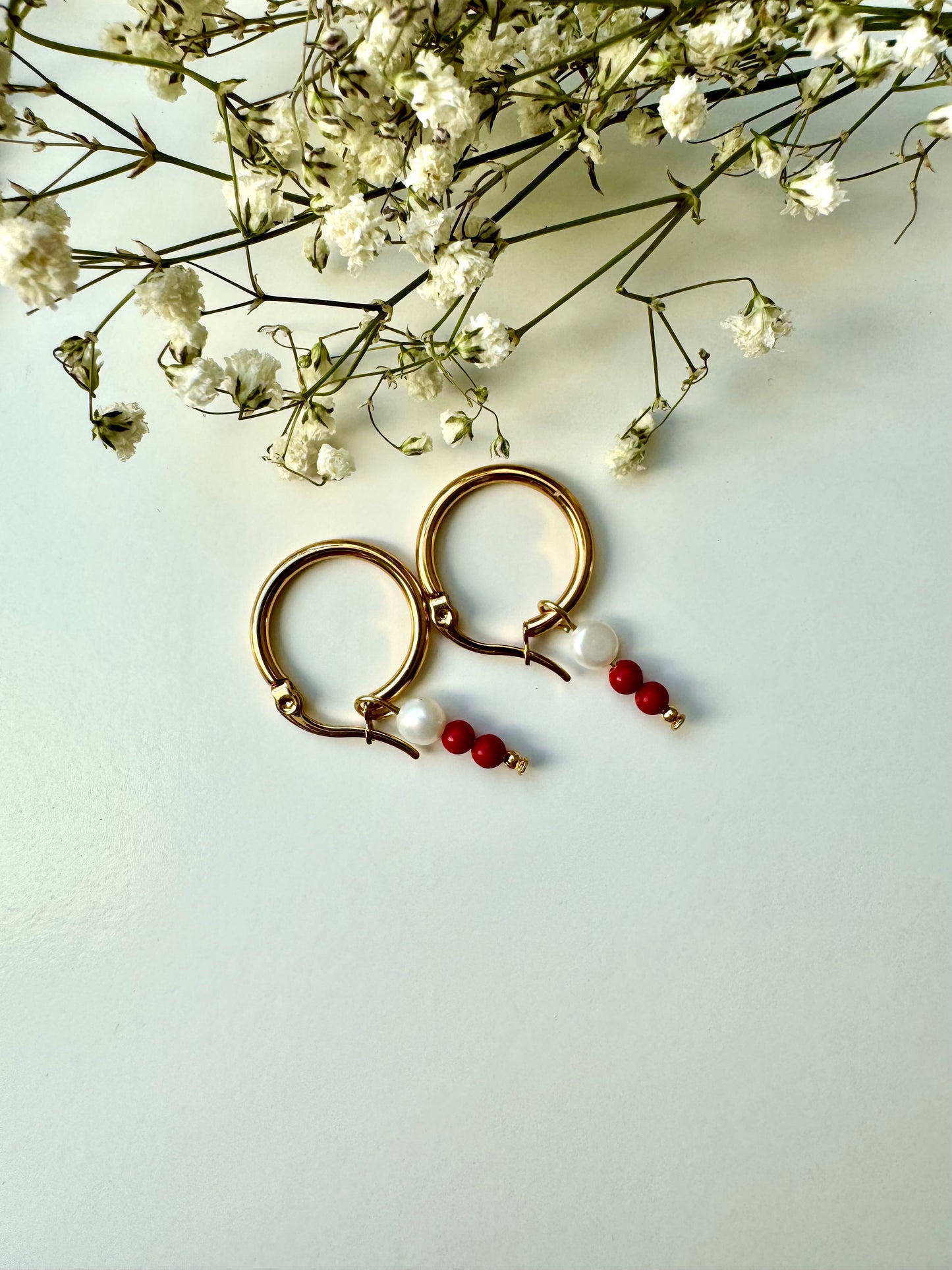 - Vergoldete Creolen mit roten Korallenperlen und Süßwasserperlen