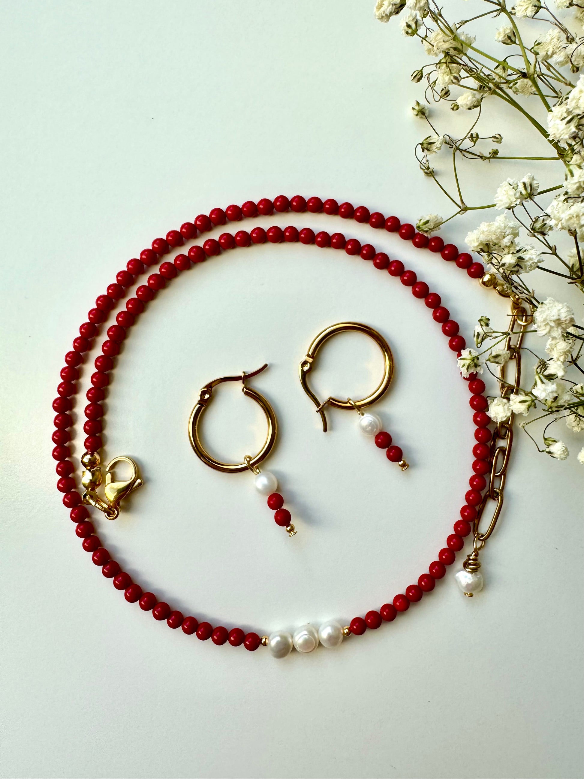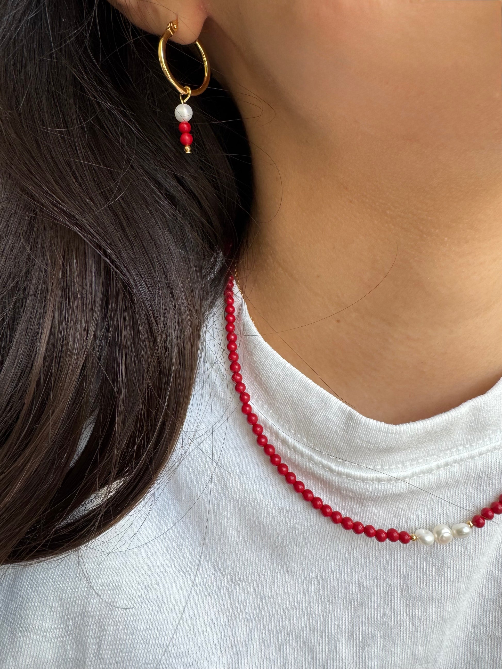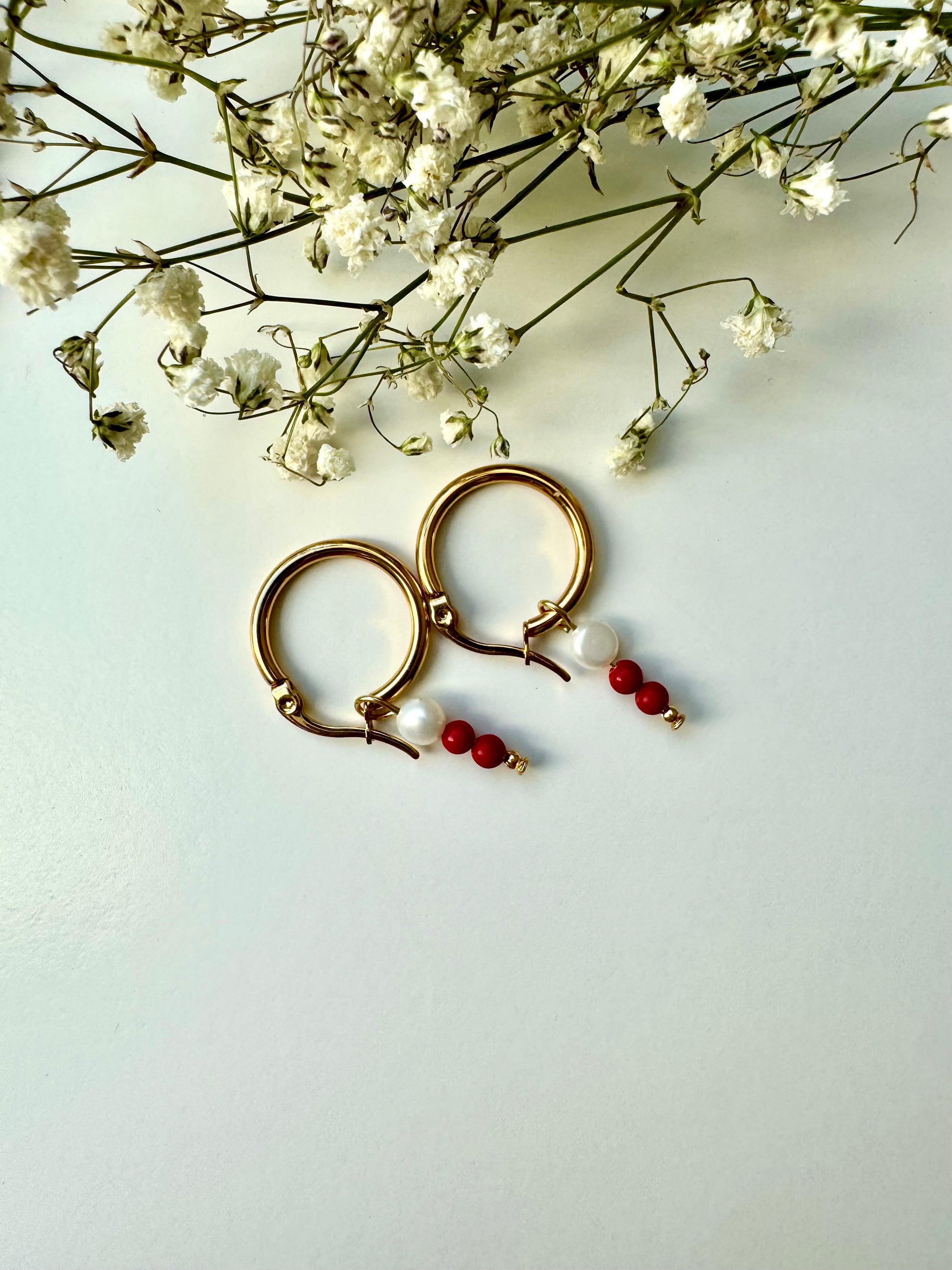 Diese eleganten Creolen kombinieren feine rote Korallenperlen mit zarten Süßwasserperlen und goldfarbenen Elementen. Das Zusammenspiel von kräftigem Rot und edlem Weiß verleiht den Ohrringen einen stilvollen Charakter – ideal als Akzent für besondere Anlässe oder als elegantes Detail im Alltag.